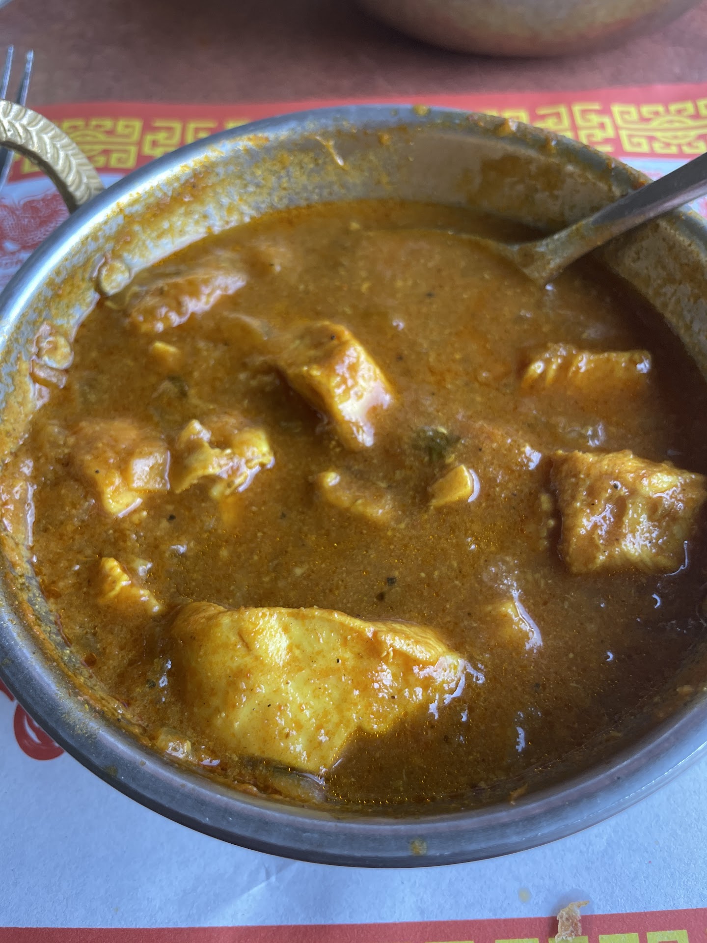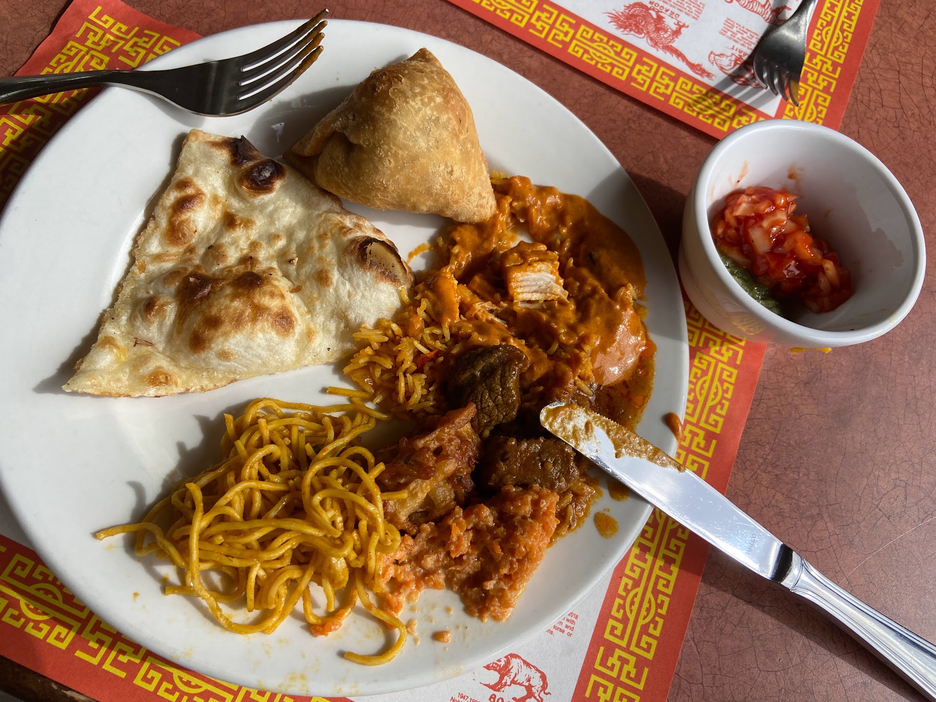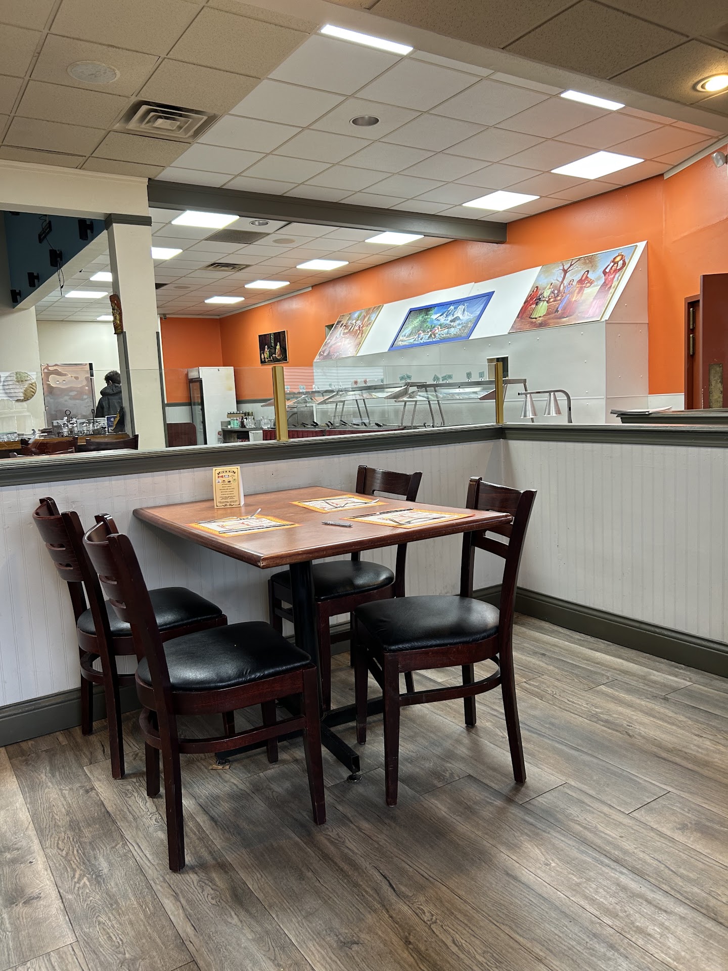 Finally ordered lunch for pick up from here, have been meaning to try it for a long time, and it did not disappoint!! I got my standard order, samosa chaat, daal, an garlic naan. The portion of samosa chaat was substantial, probably enough on it's own! But can't skip the garlic naan, which was perfectly grilled and perfectly garlicky. The person at the host stand was so lovely as well. I asked them if there were a lot of vegetarian items on the lunch buffet, she said yes and that I could go look, and pointed out an entire section. It probably would have been more economical for me to get the buffet than my order and maybe I will do that in the future. I appreciate that the vegetarian items are in their own section and clearly labeled. The atmosphere is totally fine, it is clean and well cared for, however a bit dated and the decor of the place that was there previously. I will definitely return for take out and or buffet, hopefully with my office mates. It was not very busy at noon on a weekday... we have a literal gem here - seriously...