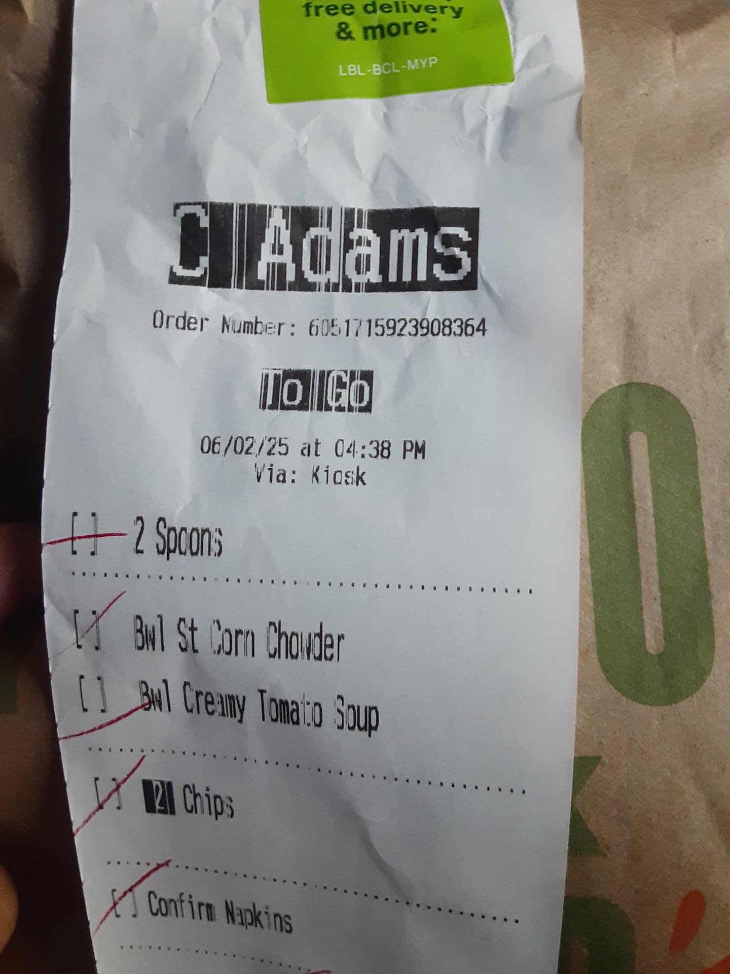 Read moreThe online ordering process went perfectly, however, upon arrival to pick up my order (which should have been ready and waiting on one of the pickup shelves) I noticed several people waiting and looking at their phones with that look of disgust and inpatients. Multiple customers approached the counter to confirm that their orders were being prepared, while others waited patiently and longingly for what we hoped would be a satisfying meal. With clear sightlines over the counter and thru the pickup windows we were all able to watch the kitchen prep workers preparing all of our orders. This was all the evidence we needed to understand why they were so behind in getting the food into our hands and mouths. At times I counted 6 people milling about while 1 or 2 were actually assembling orders and then several of them would disappear from sight leaving just 1 or 2 people doing very slow (not expeditious) prep. After watching this display for 35 minutes beyond my original pickup time my food was placed on the counter without an announcement (previous customers names were announced) lucky for me that I was watching and paying attention to the action (or lack there of) that I saw the name on the bag. I did as many others did, and checked inside the bag to confirm that the order was correct and complete and YES it was! Upon returning home my son and I separated our items and dove in. For the most part the sandwiches were tasty, yet assembled very sloppy. The soup was somewhat bland but satisfied our hunger. The overall experience left much to be desired and my biggest concern was how this location must struggle during peak times as my order was placed on a Saturday evening at 6:30. We will try again and hope for better service and an uptick in...