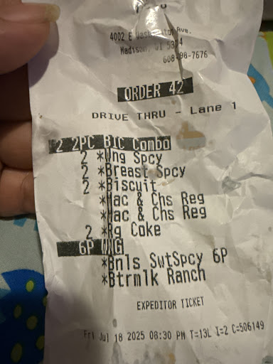Read moreITS A HIT OR MISS COMING HERE!!!! Worst Popeyes in Madison. Do not go. I waited in a longgggg line to order a 3 Tenders combo meal, with they’re new hottie sauce. I asked at the speaker for the sauce when I ordered. I waited another 7-10 mins waiting in the line for my food. Once I get to the window, I again asked for the sauce. Which the lady said okay. She hands me my food. An I drive off to find out there’s no sauce in my bag. I go back to Popeyes an there’s a line out the parking lot, with only one drive thru lame open. I tried to go inside seeing that there were people eating inside. But all the door were locked to get in. All in all. I wasn’t going to get back in a line that was wayyy to long for some sauce. So I walked up to the drive thru window while another person was getting they’re food. I explained to the worker that I order 3 tenders with sauce an didn’t get any an after all that I went through trying to get the sauce the employee gave me ONE sauce packet an said I’d have to pay for more. Which had me mind blown. Worst Popeyes in Madison. Horrible customer service. Like why have the inside closed. I even tried calling the store to see why the inside was Closed an they’re phone service...