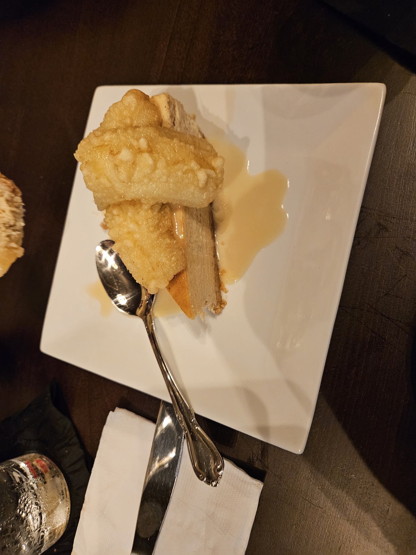 The food, we ordered 2 sharables and ala carte steaks. One person ordered 12 oz filet cooked medium-well and his steak was more medium, all pink. Another person ordered the ribeye to be cooked to medium rare, which was good. Crispy on the outside, pink on the inside. I ordered a 12 oz filet cooked medium, my steak was raw on the inside. Not warm, it was cold and raw. I ate the outsides of it the filet as those were cooked more. No one came back to ask us how our food was until the end of the meal. At that point, I asked for a box. We ordered creamed corn which was great and cacio brussels which was nothing special. Some brussel sprouts were too hard, some were too mushy. There was a little bit of charred brussel leaves at the bottom of the bowl; those were really good. Needed more seasonings.