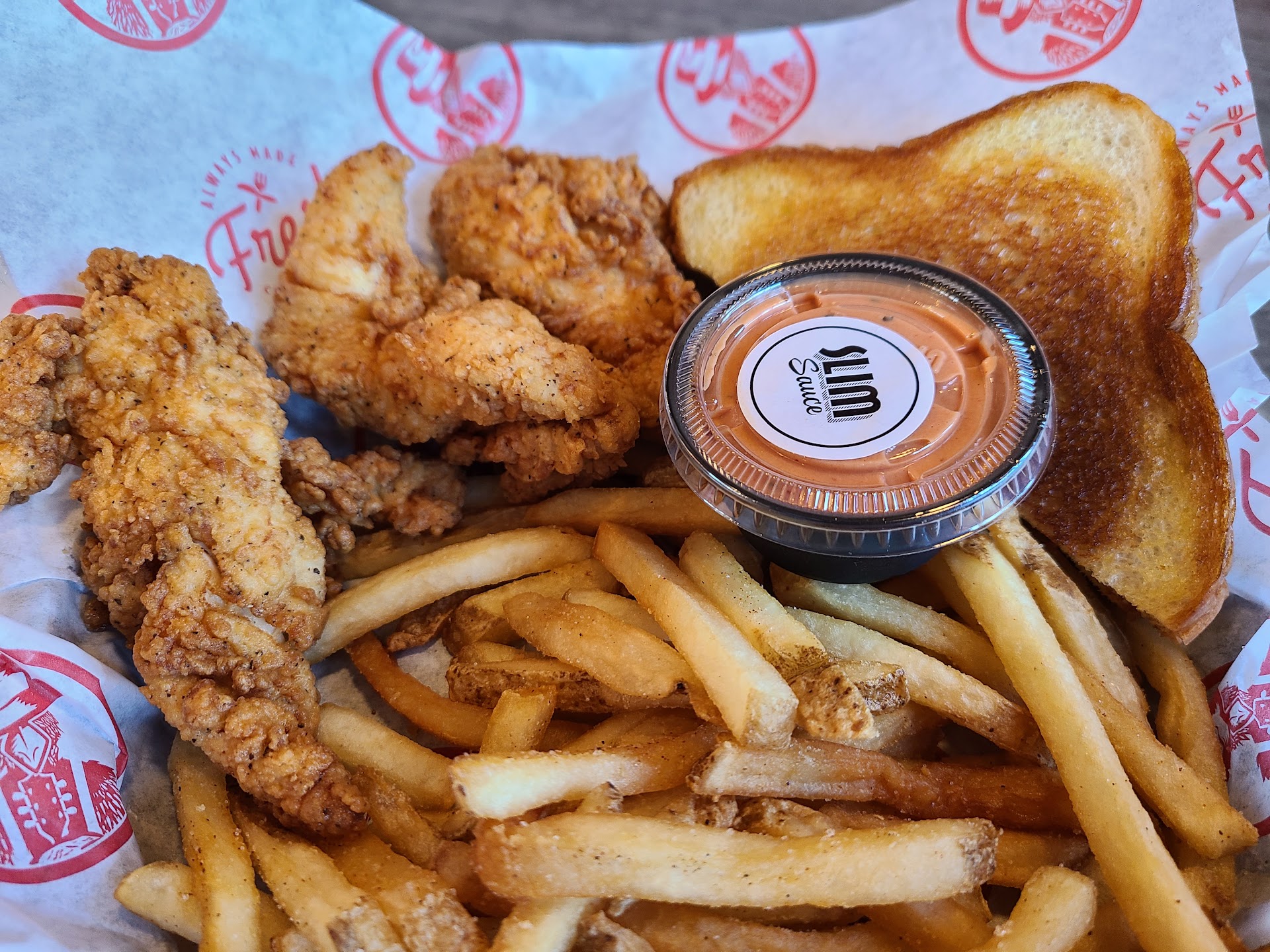 This was my first time trying a Slim Chickens. I wasn't disappointed by any means, but I can't say I was blown away either. The fries were decent. The toast was very interesting. It was EXTREMELY buttery and pressed very thin, so it was very crunchy. I thought that was pretty good, but it was a little overloaded with butter. The Chicken was average. I wasn't the biggest fan of their slim sauce. It was thicker and sweeter than I was expecting or prefer. Their fresh tea was 10/10 though. I would definitely go back just...