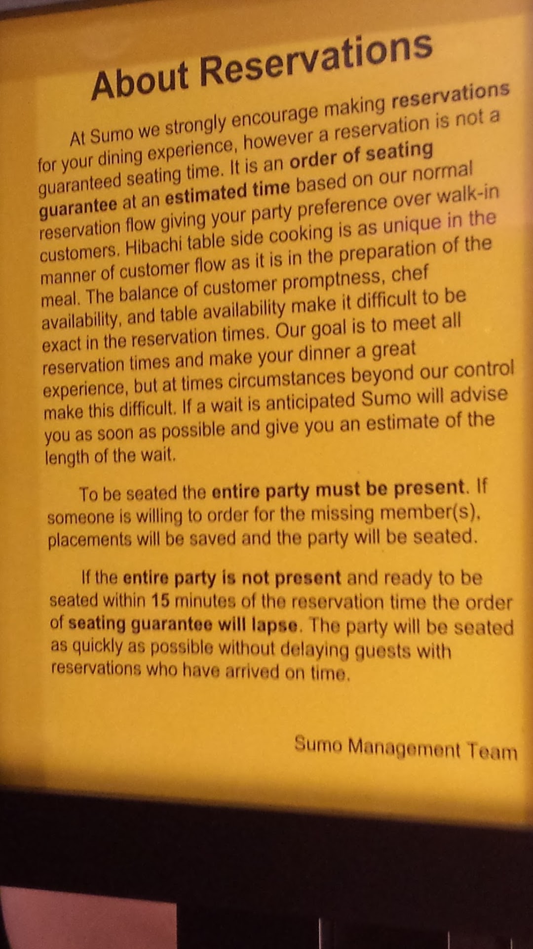 Read moreI had an extremely disappointing experience at Sumo, and I will never be returning. I made a reservation for 7:30 PM a week in advance, yet my party wasnât seated until after 8 PM, which is completely unacceptable. The hostess, Anna (or Hanna), provided terrible service from the startâshe rarely checked in with our group and didnât even apologize for the delay. When I asked when we would be seated, she simply stated that we had to wait for everyone to arrive, even though we were only waiting for one person. My boyfriend also inquired, and she gave a different excuse, saying they were âcleaning the table.â The lack of communication and professionalism was frustrating and set a negative tone for the entire night.