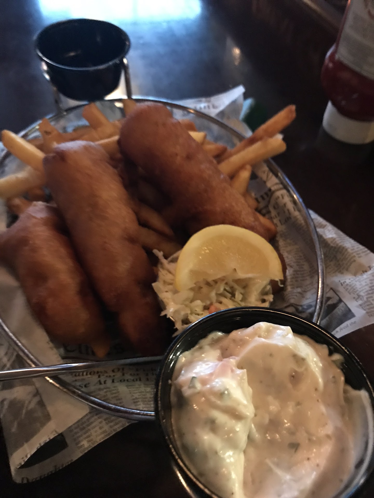 We ordered drinks. My Long Island Ice Tea was not very potent. The beer keg was spewing foam and so the beer took a long time to arrive (it arrived after happy hour had begun, but we were charged the non-happy hour price). The burger we ordered was something with Gouda and bacon. We got upcharged to get buffalo instead of beef. Despite its many toppings and cheeses, the burger was bland. We got the Nakomis Nachos. They come in an impressive stack, but most of those don’t have a single topping on them. Only the top first layer has toppings. So those were disappointing. We also got the Honey Pepper Salmon Club. It was a farm-raised salmon fillet (which, because they feed them fish pellets, tastes a lot more “fishy” than a wild fillet). The fillet was dry, and the sandwich was also not exciting considering the ingredients/description. The French fries appeared cooked in grease that was not hot enough and thus arrived wet with oil. We were upcharged for a side of ranch dressing that I said I only wanted if it was going to be free.