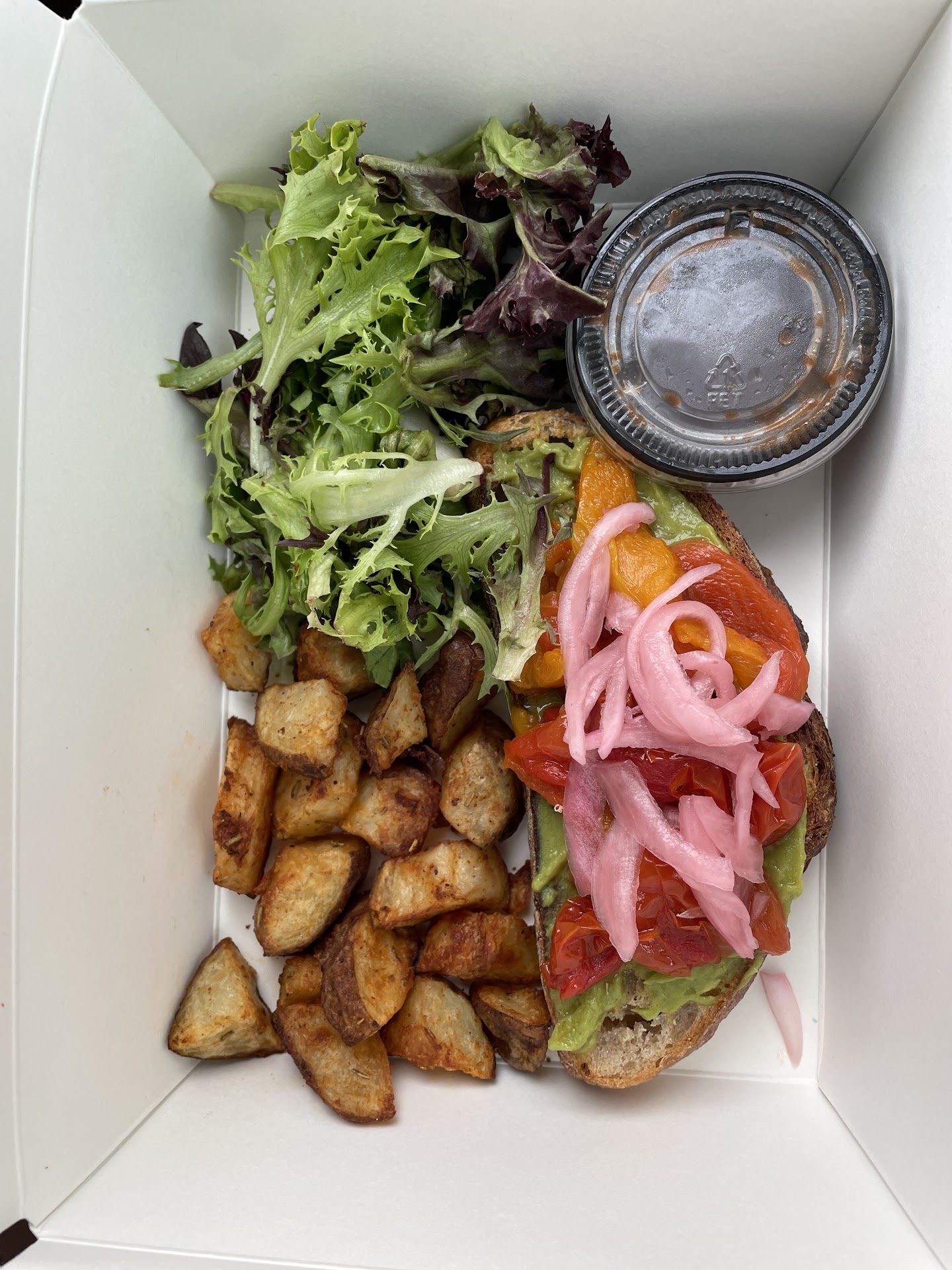 Other annoyances: Coffee is a self-serve push pot. It was empty upon arrival, and there was about 10 minutes of waiting for the next batch. TV screen as a menu (I just hate these. Honestly if I'd seen this before walking in, I would've turned away.) They allow "well-behaved dogs" in a restaurant, I'm a dog lover but c'mon. barista committed many unforgivable sins at the machine. Grinding with no beans in the hopper, leaving shots for like 4 minutes before adding to a beverage, trying to re-steam milk to get it to temp, this poor soul was not trained. I'm still waiting for two orders of avocado toast... lol. I honestly kinda cannot believe it?