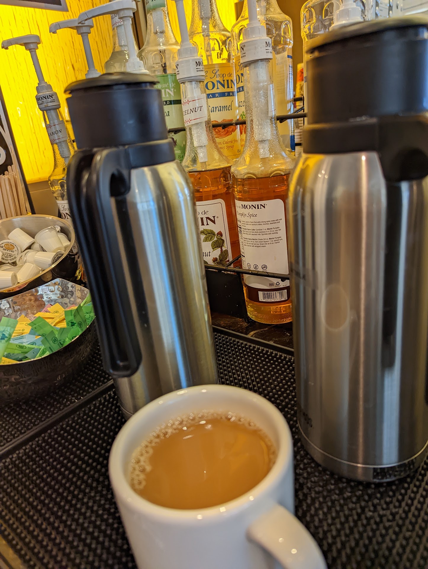 They had a coffee bar (pictured) which we all appreciated with a variety of good coffees (including a decent decaf), creams/milks and flavored syrups. We were all over the moon (because we all needed the caffeine, and we didn't have to settle for just ok coffee).