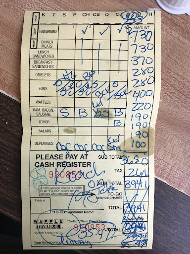Read moreMy fiance and I ordered our food. While we waited we watched a yelling match between the chef and another worker over something. As they served the eggs, hash browns, and bacon, they said they made my fiances sandwich with bread instead of biscuits, so we ate the eggs and hash while continuing to wait. The waitress drops off the correct biscuits with our sides of bacon and keeps moving, so I tell my fiance to go ahead and start eating, assuming my waffle will be out soon. I try to snack on my bacon while I wait but the bacon is cold. Not just cooled off, I mean room temperature. We don't see the waitress again until about 10 minutes later when she comes up and asks how everything is. My fiance mentions we are still waiting on my waffle. The waitress is very apologetic. She had started it but forgot because the timer is broken. The chef, likely having overheard, runs over to the waffle iron and gets a waffle started. She (the waitress) throws her hands up in defeat and tells him (the chef) the waffle is burned because the timer is broken. The chef gets a new waffle started and starts the timer with no issue. At this point my fiance has eaten all he's going to and I just want to go home. So he goes to the register pays for our meal, tells them to please make the waffle to go, and bring another to go box for his food. When the waffle is ready she brings it in a box in a bag and hands it to him. He has to ask again for another to go box for the rest of his leftovers.
