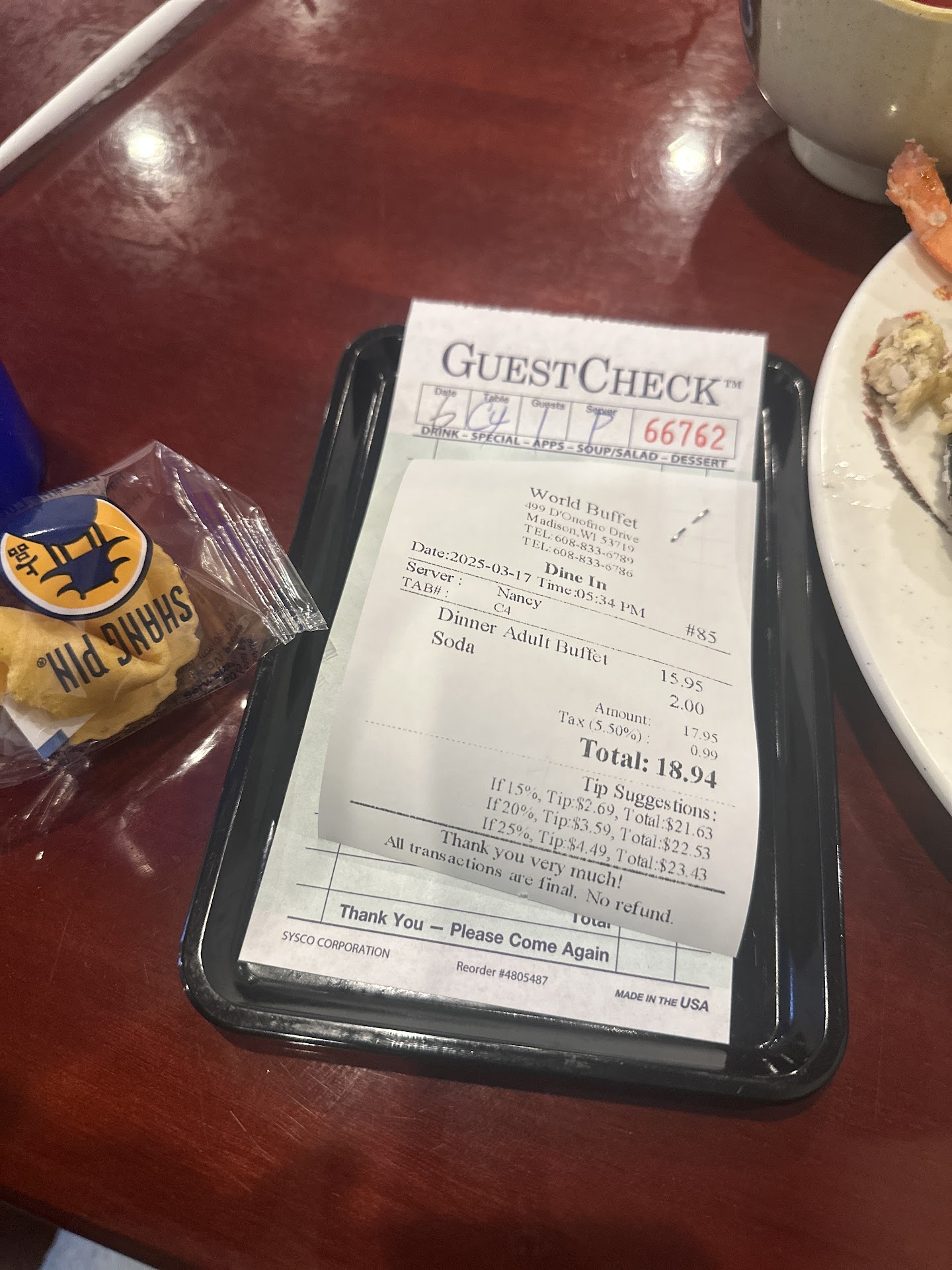 The not so good: some of the food in the hibachi buffet (the raw ingredients that you put on a plate for the cook to then cook) was literally frozen the person that brings you to your table really seemed like they didn’t want to be there I wanted to ask some questions about how the “make your own soup” worked, but the cook was on their ear buds on a phone call so I didn’t ask and just skipped the soup station I still don’t get why at buffets the receipt still recommends tipping at least 15%, when the staff doesn’t actually serve you (for the record, I did tip 15% - I tip more at restaurants where the servers take your order and serve you) the ginger (I think it is) at the sushi bar was in a metal container (per usual), however the ginger was submerged in water making the ginger soggy (I wasn’t sure what the purpose of the water was)
