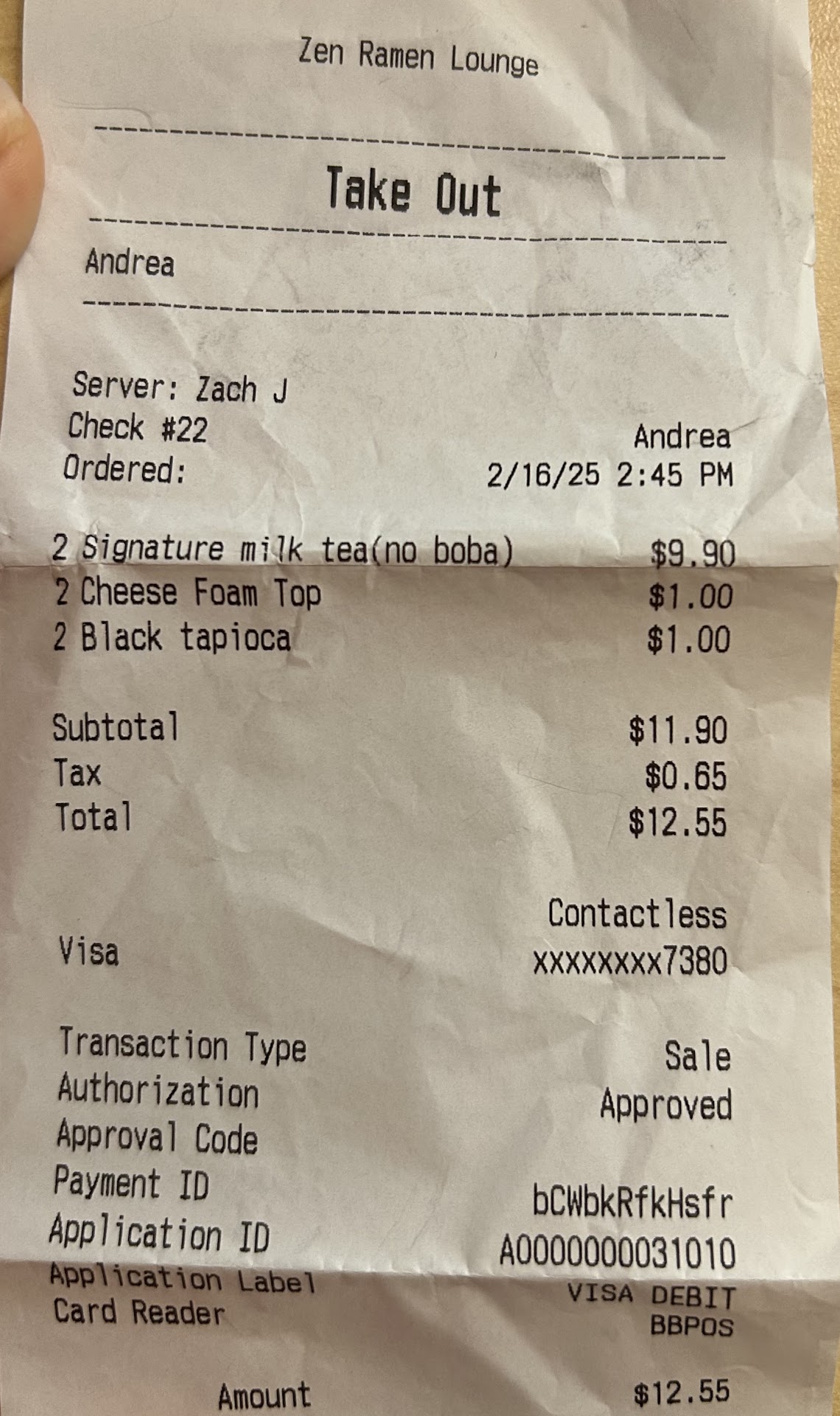 This past Sunday 02/16/2025 was our first time in Zen Ramen Lounge, we were craving some boba an wanted to try a new place, we live all the way on the west side and went all the way to this place that is 25 min away from home, to this restaurant with 4.6 star rating that we thought was going to be amazing. IT WAS NOT! We got there super excited to try their boba but the experience there was unpleasant, nobody acknowledge us, nobody greeted us, the only person that was there didn't even take a moment to at least inform us that it was going to take a WHILE. After 20 min, they guy finally comes to the register but still doesn't acknowledge us, doesn't welcome us, the phone rings, he grabs the call, the phone rings again and grabs the call again and FINALLY he asks us what would we like, without any friendliness, without any eye contact, no great costumer service AT ALL. I told him my order the clearest and calmest way, he didn't get it the first time so he asked for clarification which is okay, repeated the order to him and we thought that he was going to make our drinks right away for all that time he had us waiting but no, there he goes again to the area were they prepared the drinks, this place had no organization, we waited 20 MINUTES to get our boba drinks, but wait, it gets worse. During those 20 min, they guy whom I believe his name is Zach J, at least that's what my receipt says, barely had milk tea for our boba milk teas, tells us after being charged $2 dollars for cheese top that he "just checked and doesn't have enough cheese top and it will mean that he needs to make more (which he didn't) but will see what I can do" which was really frustrating because if he knew he didn't have enough he could've said that before he charged us or at least offer a refund. He did not apologize one time for all the time we were waiting just for two simple milk teas. He finally gets to the part of the cheese top and when I tell you we were getting sprinkles of cheese top that's exaggerating, at this point my wife and I are upset at the fact that that was clearly not the regular amount you get for cheese top, especially when we payed $2 extra for cheese top, ARE YOU KIDDING me!!! We thought that maybe the guy was going to at least have a gesture of giving us a coupon or something for all the time waiting and not getting an actual cheese top toping but he DID NOT. This guy was SO DISRESPECTFULL when he had the audacity to throw both of the straws at us, UNACCEPTABLE. A caucasian lady came during those 15 min for a pick up order and she actually had a boba drink, he gently handed of the straw and drink to her, he did not throw the straw at her like he did to us. This did not make me feel welcome as a Latina and LGTBQI+ women, that gesture of him spoke a lot. We did not mentioned one thing those whole 15 min that we were just observing him for him to act that way towards us. We were there 40 min for 2 drink only! INSANE!!!! First and last time there, do not recommend this place if you're looking for a great customer service experience DO NOT GO TO ZEN...