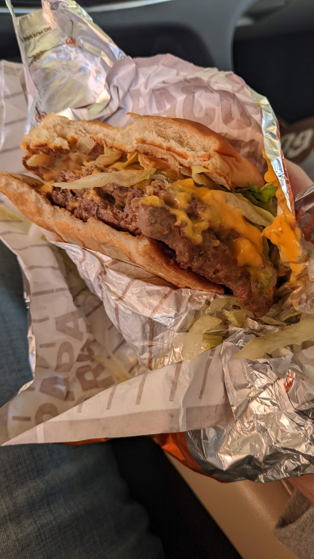 Now for the food. I just got a burger and fries as you can see here. This was hands down probably the worst fast food burger I have ever had. This thing was tasteless and dry but had a weird aftertaste almost like a school lunch burger (if you know you know). I couldn't take anymore than 2 bites before I flat out just couldn't eat it anymore. 1/10