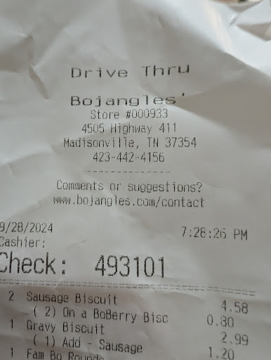 Read moreWell guys, I've got some good news, and some bad news, the Bojangles here has a worker (didn't catch her name, but I know she was working here at 9/28/2024 at 7:28 pm.. ) we were accidentally given someone else's food by mistake, and they found us a few minutes later (after we had opened the food and touched it) she asked for it back as she was going to (interestingly) give it to the other customers who ordered it.. after we had touched it... My dad told her "you aren't going to give that to the other people after we opened it right?" She replied "no, I'll take it inside, throw it away and make more" we gave it back, then pulled away, about 20 feet forwards, it turns out that she GAVE THE FOOD SHE TOOK FROM US TO THE CUSTOMER WHO ORDERED IT! SHE STRAIGHT UP LIED TO OUR FACES AND.. also compromised the health of the other customers, idk if she does it often or not, but beware, you might get food that was in a car with dogs or toddlers. Or worse, someone sick.. beware... Good news is.. well,...
