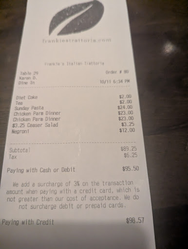 Conclusion The quality of the cooking at Frankie's Italian Trattoria is excellent, but the operational issues—the extreme reservation delay with no indoor waiting area, the slow and inattentive table service, and the mistake on the check—created a very frustrating experience. The lack of service and multiple errors meant I did not feel it was fair to leave a typical tip, which is a rare occurrence for me. While I understand Saturday nights are busy, some of these issues were simply excessive.
