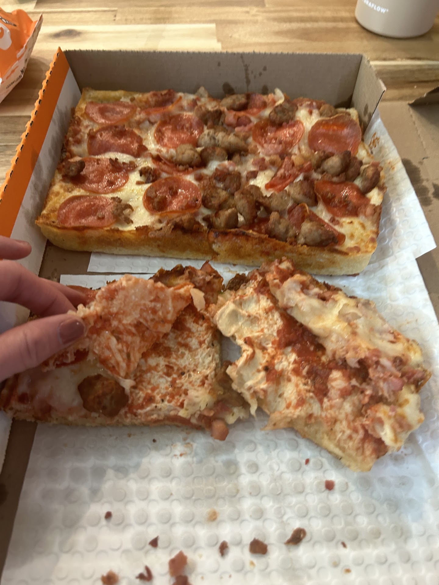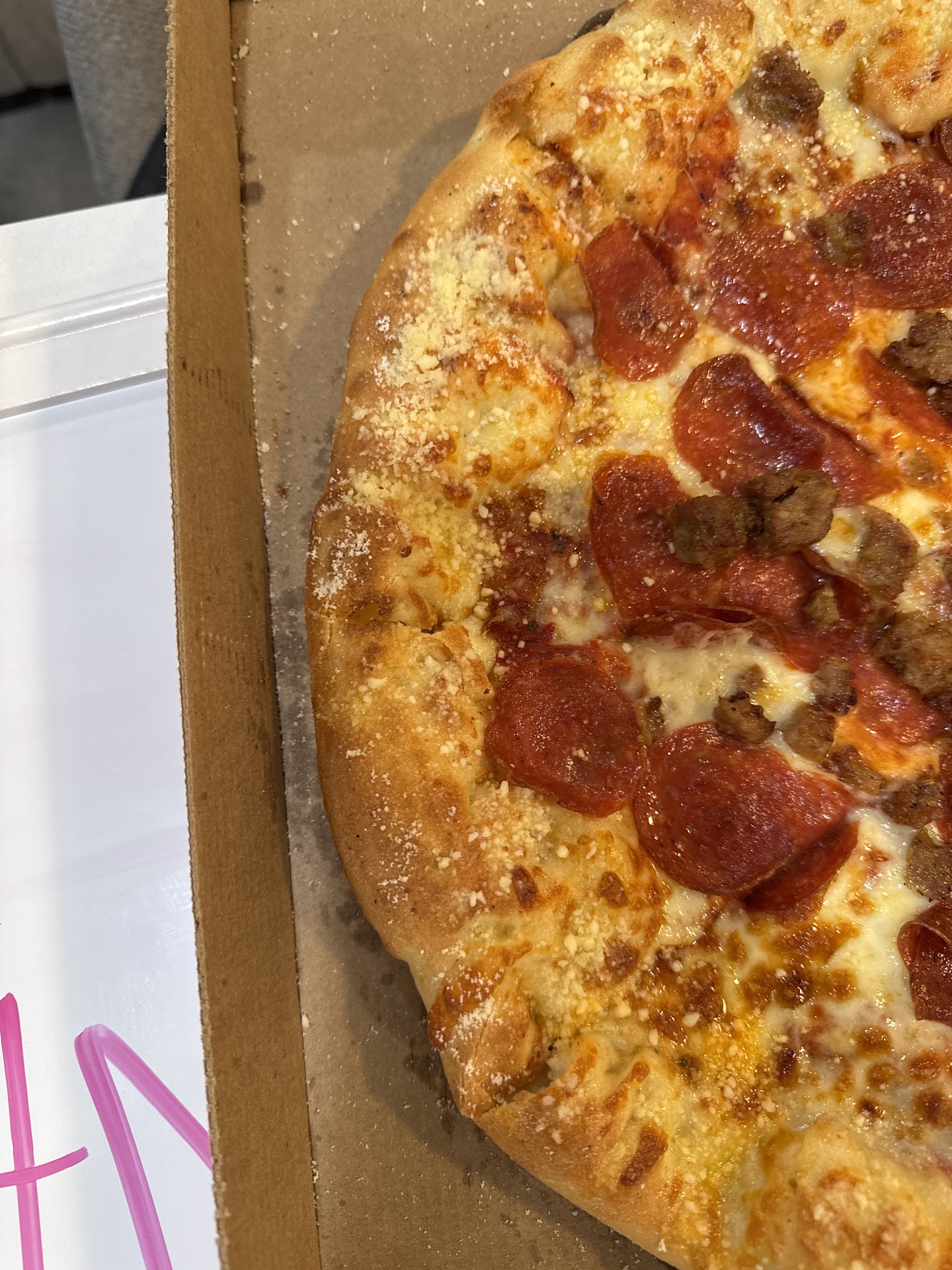 Unfortunately I need to update my review after a few incidents over the past year or so and especially the incident tonight. I'll try and be as thorough and fair as I can be so people know the good things and the bad things because it's definitely a mix. First off, the app in my opinion has the biggest sway in the kind of product you're getting. It really does save you money like it says it does when you pick up but although it says it will save you time by planning ahead my experience is it gets messed up ordering online and often takes a considerable amount more time. I would never order delivery off this app. It costs a lot more and they have not once gotten our order correct. It goes through door dash and they either forget something or bring it to the wrong place without fail. Up until not too long ago the drive thru with online ordering has worked fine. Lately we've noticed it taking a little longer than if we just drove up and it didn't bother us too much because it gives you a time and we also like them made fresh. Lately it's been saying it's ready, we go and then wait a considerable amount of time after. This is frustrating because the whole point of ordering ahead is so that we can be efficient. It always says it's ready and usually I've noticed that once it says ready in their system they will prioritize every other customer before you because whatever milestone was reached they needed to. Tonight was particularly unfortunate. Ordered 8:45, ready 9:05 we get to drive thru 9:05 because we're close. We're given a number and told it will be out in a few minutes. A little frustrating after we came when it said it was ready but still understandable. 9:15 not here still so I call. Someone says it is going in the oven now and says they had to push it thru their system before they could start making it. (Why have a system like that? Why alert people it's ready before you start making it?) 9:30 rolls around, we've seen like twenty people get their orders but a lot of the other orders also seem like they're getting annoyed at the time it's been. Many people have gone threw the drive thru and just gotten served. Normally I'd say, 'no worries maybe they ordered ahead' thing is we also ordered ahead and it told us they were ready 25 minutes ago. My wife flags down the gentleman bringing out pizzas and asks about ours. They say they can't find it in their system. He goes in to look again around 9:35 apologizing and saying we could get a free soda and/or crazy bread or something. 9:40 we get our cold pizza brought to us and he leaves before my wife can ask if we could still get a freebie for sitting there so long. Additionally the pizza is not cut all the way through and seems like it has been done for some time and definitely not fresh out of the oven. On the flip side, the day staff is phenomenal and very quick and kind. One of the managers especially always has a huge smile. If you're going here be wary of the app and try not to go late at night. Overall we have pretty great experiences...