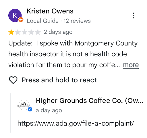 2 update! So they took down their responses because I called them out for trying to save face after their original comment on this review, I added the screen shots Update: I spoke with Montgomery County health inspector it is not a health code violation for them to pour my coffee from a paper cup into my Tumbler. She described as a customer service issue as there is no legal health code reason that my cup of coffee could not have been poured into my Tumbler.