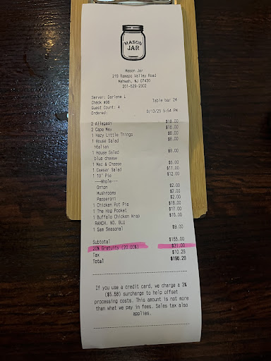 It breaks our hearts to give Mason Jar a poor review. My wife and I first met at Mason Jar. We’ve had many great evenings with friends and family, and the food is often very good. First I’ll preface this with the understanding that all businesses are suffering right now with a lack of talent. It has obviously hit many restaurants and food service establishments. Service at the Mason Jar has been on a very slow decline and tonight capped it off for us. Our server was inattentive, forgot parts of our order, and needed to be asked multiple times for things like straws or napkins. After waiting over 90 minutes for our entrees, some of the food came out cold - a baked potato had a pat of butter that wouldn’t melt. The windows were open and a screen was broken so there were flies hovering around our table the entire time. The evening sun came right into the window at our table but some of window shades were missing. After we asked for the check, we were then asked if we wanted the ice cream that came included with one of the meals; we declined as it was now 2 1/2 hours since we sat down and we have a small child who was running up on bedtime. The biggest slap in the face was that Mason Jar has now added a forced 20% gratuity on any check; we were a group of 4 and a baby. This is simply outrageous. We always give 20% or more for good service but this night, it really should have been 10-15%.
