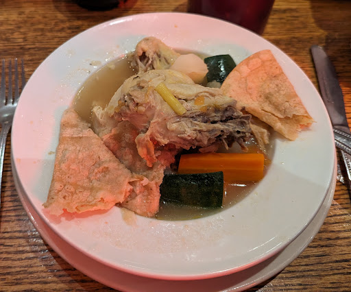 We chose the Caldo de Pollo ($14.95) as a soup-starter, and it was delicious. The portion easily served the two of us; it contained a half-chicken poached in a broth with vegetables (photo 1). Fried rice and tortillas came with it. For entrees, my wife ordered the Costillas de res en Tomatillo: boneless beef short ribs with roasted potatoes and tomatillos ($24.95, photo 2). I ordered a Chimichanga filled with ground beef ($16.95, photo 3) along with a red sangria ($10.00, very good!). Both entrees came with refried beans, brown rice, and tortillas. The food was tasty and appropriately seasoned.