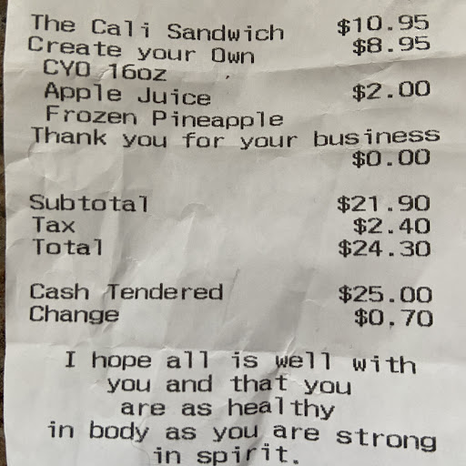 I ordered the Cali Sandwich with my smoothie, and it was dry and unappetizing. It didn't taste very healthy either. My entire party of five tried some to make sure I wasn't missing anything, and we were all very displeased. One of my friends had the BBQ wrap, and it was the exact same, not good at all. Not to mention, the sandwich took nearly 20 minutes to prepare and it was smaller than the size of a traditional sandwich. The proportions on everything are small, my buddy's wrap was no more than about 5 inches in length and could fit in a pocket. The sandwich was $10.99, and because I ordered only one ingredient in my smoothie, I was charged significantly more. I'd go as far as to say charging more for a smoothie because a customer has an allergy is discriminatory. My smoothie was $8.95 and $2.00 extra for the undisclosed apple juice charge, insanely higher than the $6.00 advertised for a smoothie combo with the purchase of a sandwich. The smoothie was good, but maybe $6 good, and definitely not $11 or anywhere close to that good.