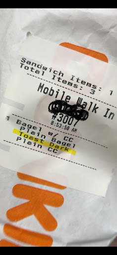 Read moreMy husband ordered me a plain bagel, toasted DARK. Received the mushiest bagel ever(can’t input video), the bagel looked the way bread does when it comes out of the fridge. You can tell they threw it in “warmed” it up for 5 secs and tossed it in the bag. Care more about their speed than their quality. Called back for a refund and they said i have to contact customer service. My husband called and then it was “we don’t do refunds come back for a new one tomorrow” but we know how that would go. I’m just never returning or spending...