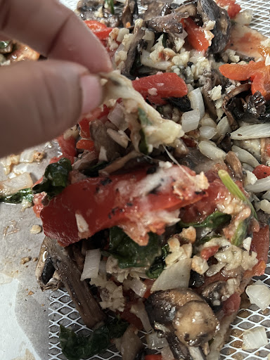 I may be wrong about who made this pizza, but it seems to be a different person by the way it was organized and the different ingredients on the pizza because I had bought cheeseless veg pizza-gluten free for dinner before. But today was...
