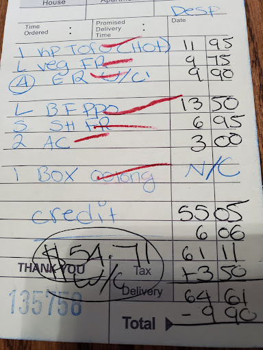Then the food arrived. It was over 2 HOURS late. They forgot to include the 2 orders of Almond Cookies that we were charged for (shown on the pictured receipt). And considering I'm a vegetarian, I was quite beyond disgusted to find pieces of beef in my Kung Pao Tofu AND I found shrimp shells in the Vegetable Fried Rice (also pictured below). Luckily, I have a habit of picking through my food before eating it. For this exact reason. It was sickening. And left me wondering how this happened. Are they not washing their pans when starting new orders?!? And how did just the shells end up in there?! I could see shrimp pieces if they're not using clean pans, but just the shells?