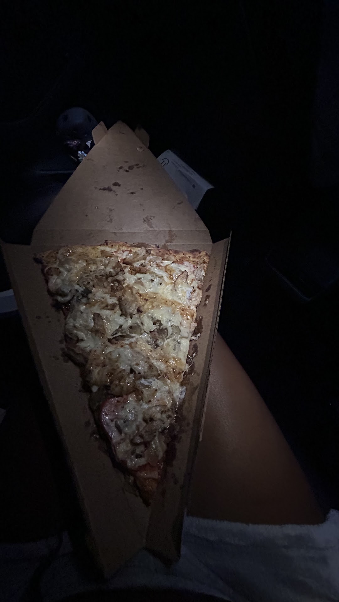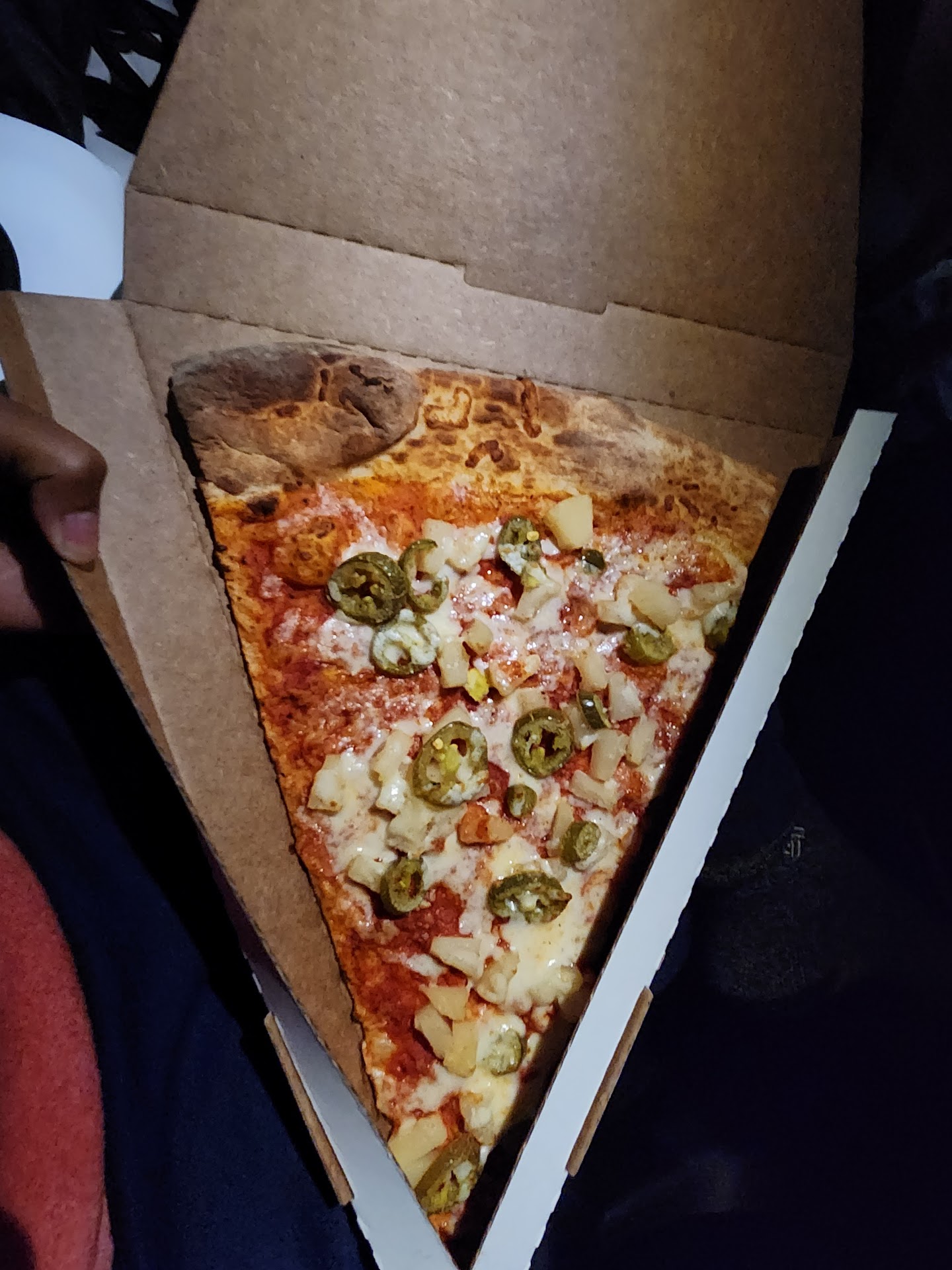I paid $9 for a slice which was hard to sit with but once I saw that box i knew I had got my monies worth. Toppings jalapeños and pineapple cause pineapple belongs on pizza if u know about taste 😜