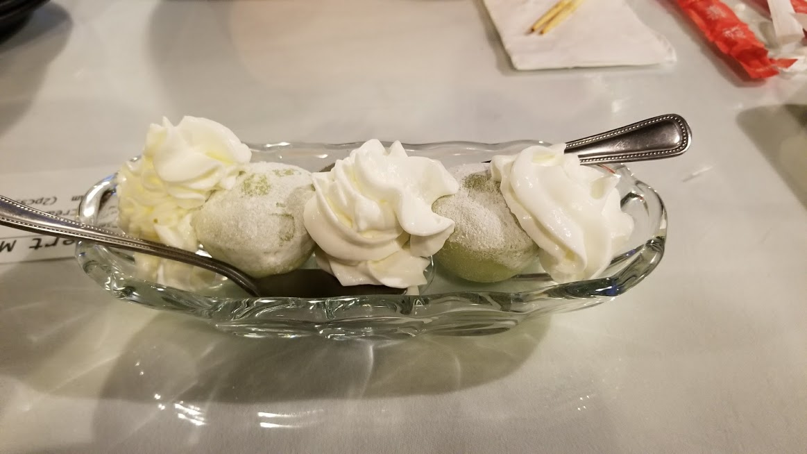 So then we got the green tea mochi ice cream for dessert. They were little green mochi balls with green tea ice cream inside, served on a plate with whipped cream sprayed around them. I feel like they were meant to be more of a hand-held treat. It was awkward to eat them with the provided spoons, but they were still good. Not super sweet. Green tea ice cream is such a good palate cleanser for the end of a meal, and the mochi just made it fun!