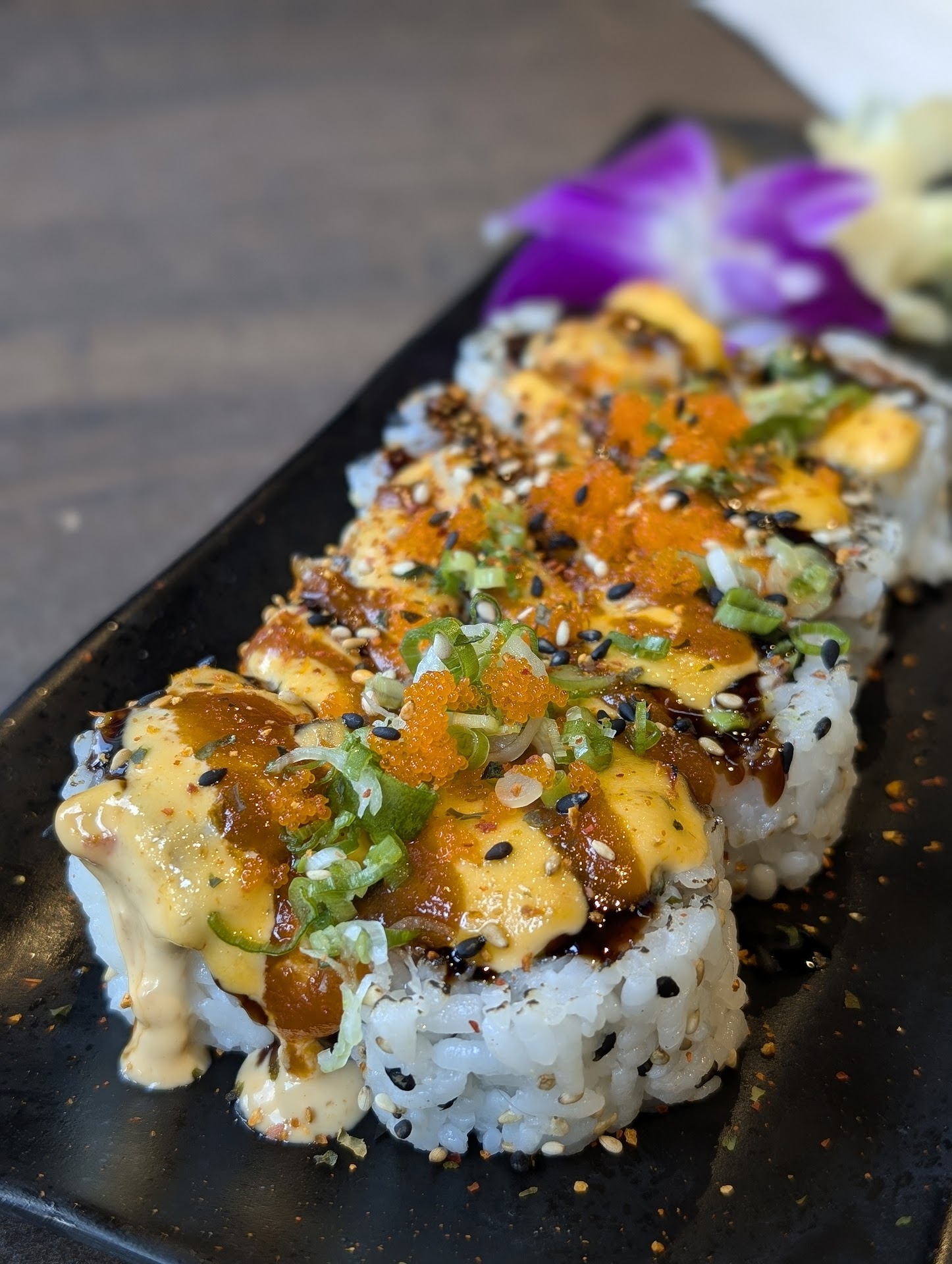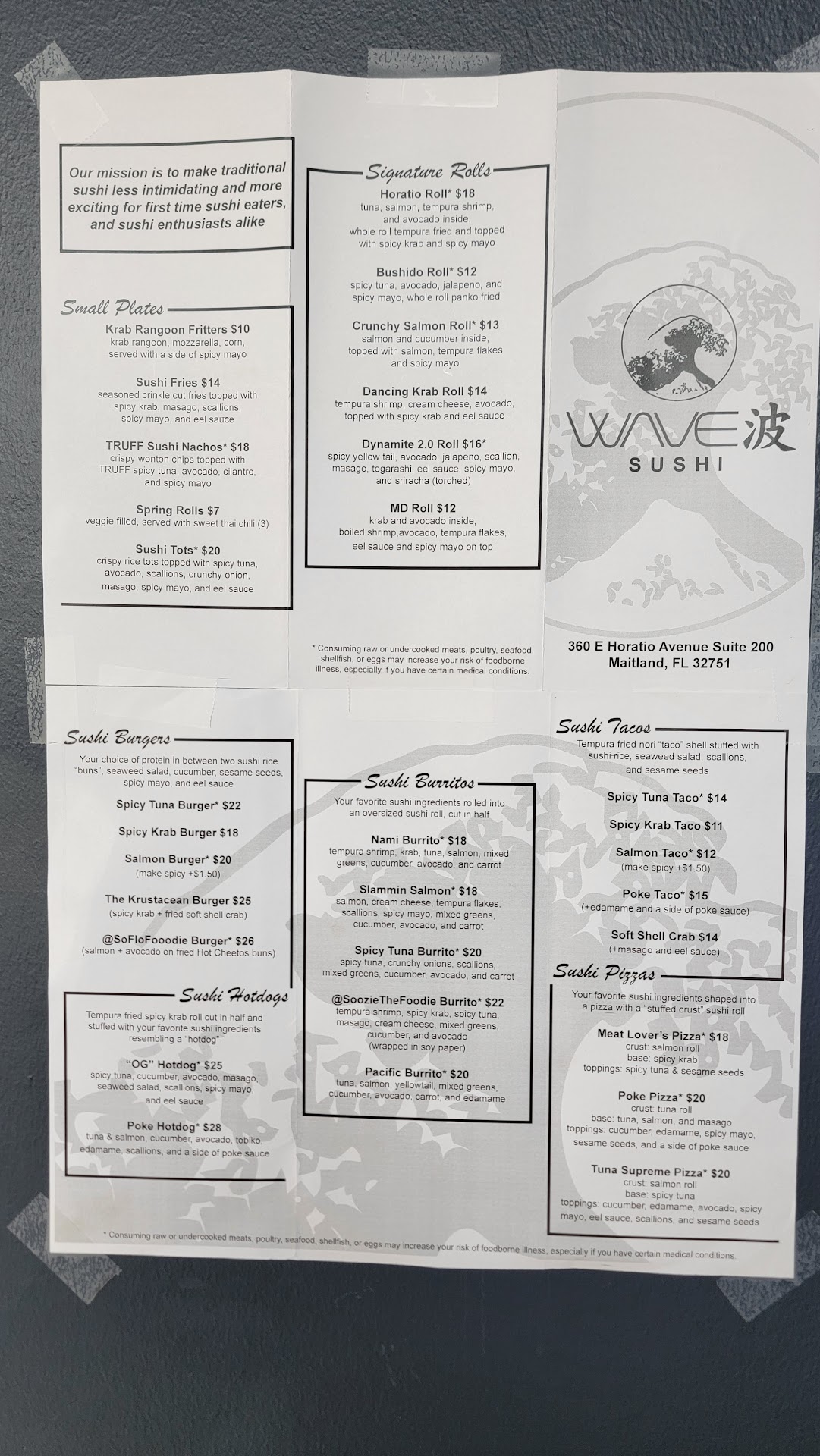 I have been to the Mt.Dora location so I was very excited to try this new one that is much closer to me. In a building off Horatio in Maitland that has a foxtail coffee and a pizza shop, this small but neat and modern new WAVE was really clean and nice. Indoor and outdoor seating available. Once inside you order at the counter and they give you a number and you take a seat, they will bring the food out to you. I will say the menu is drastically smaller than the original wave. Similar to how Chibi Domu operates as a smaller domu location, this is similar. We got 2 rolls and I got a "spicy tuna burger" I paid 44+ dollars for my burger and 1 roll. That's pretty steep. The first roll we got was the Dynamite 2.0? It was SO good. But really small for the price of $16. But it was very very good and had TONS of flavor. The smokey torched sauce ontop really set it apart as probably my favorite thing we ordered. I got the Bushido roll for $12, it was ok. It was very plain tasting and really just loaded with rice. We ate all of it regardless. Now to get to the burger. You can ask for your rice patties to be plain or fried, I wanted fried to give it a crunch. The spicy tuna mix inside was delicious and very good quality..but once again the rice portion was just astronomical. You are paying for so much rice. And I absolutely understand that the rice is what gives structural integrity to a lot of their gimmicky sushi like the pizza or the burrito or even the burger. But kust know you are mostly paying for a big amount of rice in the shape of a "burger" I really enjoyed my time here and all of the food was delicious but I think my favor goes to the OG...