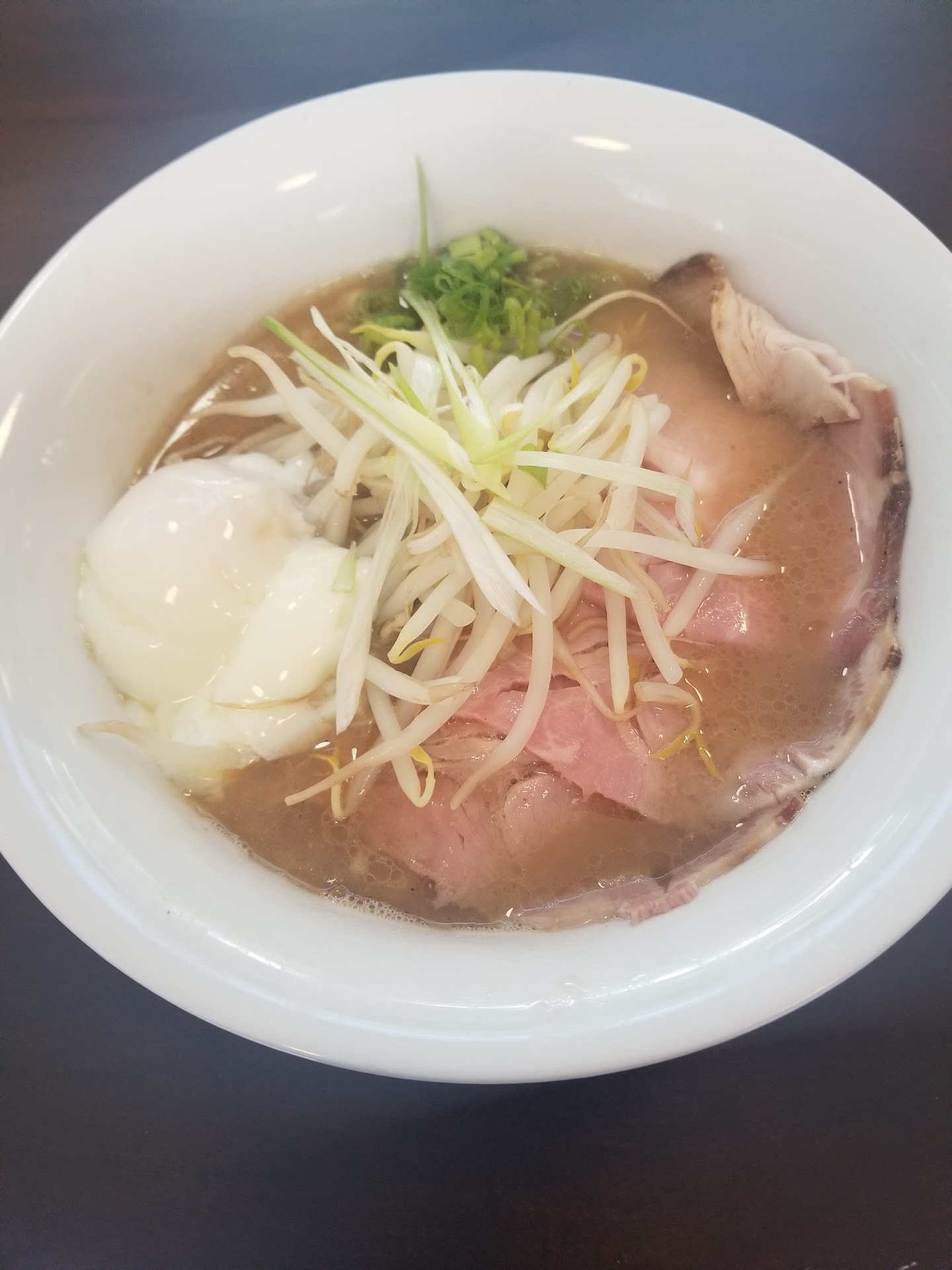 The toppings were also great. The chashu was really large and thin sliced, with a flavor that went all the way through the meat. The sprouts, leeks, and scallions added a nice crisp texture and fresh taste. The egg was surprising in a good way. I was expecting a marinated egg but got a nice poached egg with a solidified but soft and creamy yolk inside. I highly recommend getting the egg, because it adds another layer of creaminess to the broth.