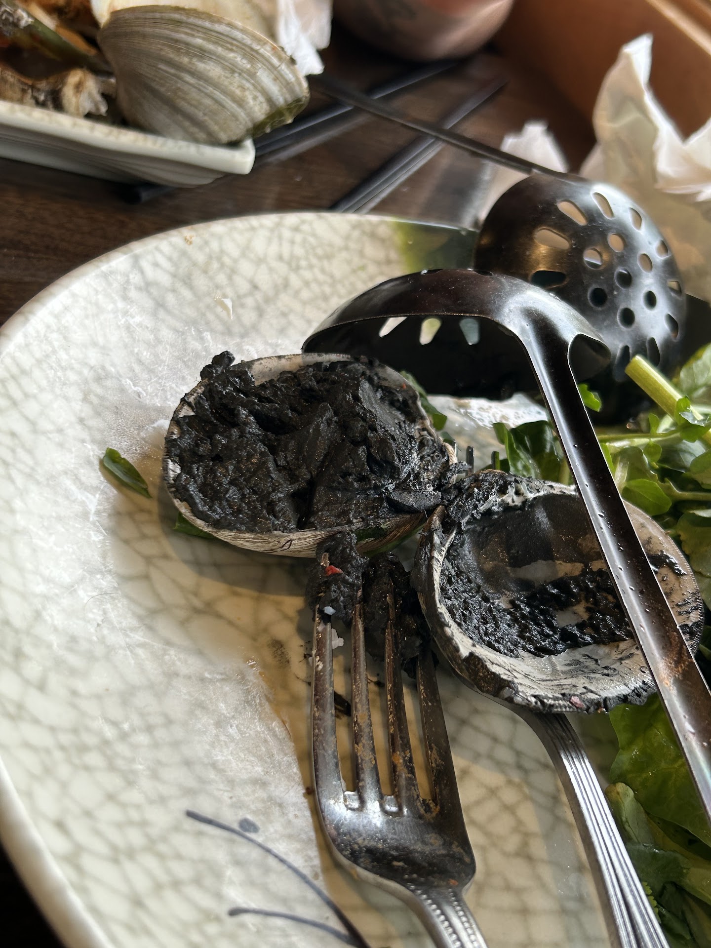 The clams come closed, so early in the meal my husband put them in his soup. Unfortunately one of them when he got it out (almost to the end of the meal) wasn’t fully opened so he opened it with a fork and it was all black inside filled with something that can only really be described as black sludge. See photo….