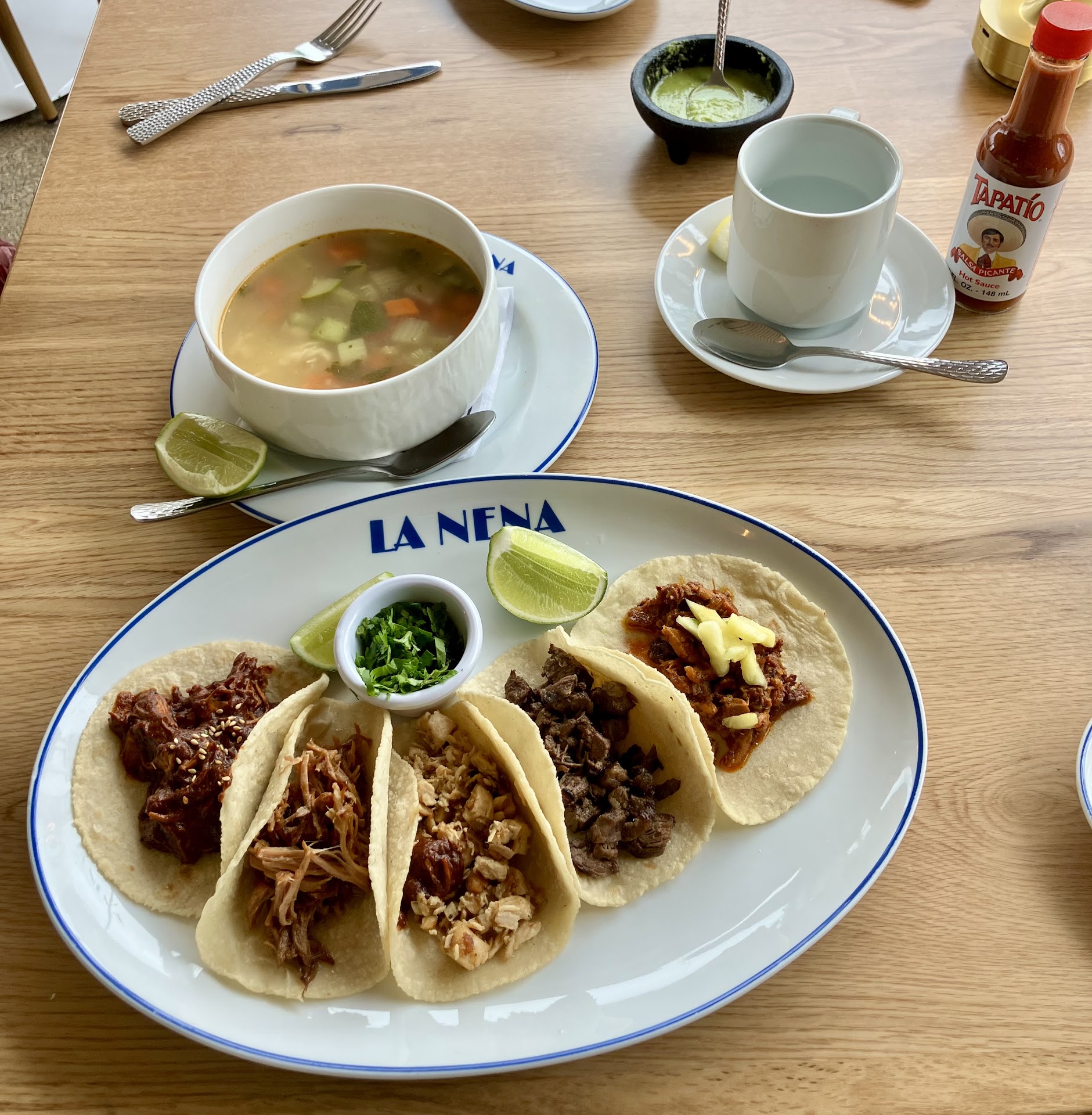 My wife and I had a great experience at La Nena Restaurant and Cantina in Malibu. We started with the ConsomĂŠ de Pollo (chicken soup), and it was exactly what we were hoping for - flavorful, and hearty. The soup was generously filled with tender chicken, carrots, a bit of rice, and just a touch of celery. It had a homemade feel and was perfect to start our meal. We also ordered the Taco Combination Plate to sample a variety of tacos, and it did not disappoint. Each taco had its own unique flavor, and the meats were well-seasoned and fresh. It was a great way to try several options and get a feel for their taco offerings. The chicken taco was a bit on the dry sideâit seemed like the chicken might have been cooked earlier and then grilled again, which affected the texture. However, the chicken mole, pork, and carne asada tacos were all very good, each offering rich, well-balanced flavors. The chicken soup was excellent from the start. After my wife enjoyed her half, I added a squeeze of lime and a bit of their green salsa to mine, which took it to the next levelâabsolutely delicious!