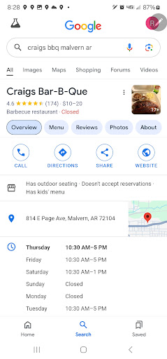 Read moreWe've been coming to Craig's for several years now, and we always get the ribs. Once I find something I love at a restaurant, it's hard to order something else. The ribs are great ! They give you plenty of extra sauce which is sweet and a little spicy. Fried pickles, and beans are good. This is a local family business. Craig, and his wife run the place, and their son is there sometimes too. I highly recommend you try the ribs if you...