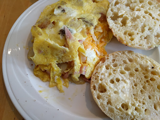 I ordered a Farmer's Omelette which came with English muffins. My husband ordered eggs over easy, home fries, and bacon. An order of pancakes AND 2 full breakfasts for the kids were also ordered. . My Farmers omelette was so greasy. It had at least 1/2 cup of cheese on top of the oil that was used to cook the omelette. I scraped some potatoes, a little bit of eggs, but otherwise it was inedible. The English toast were hardly toasted and they were slabbed with a ton of margarine. Margarine doesn't melt so there was at least tbsp on each slice. It was disgusting. . We asked for fried eggs medium but...