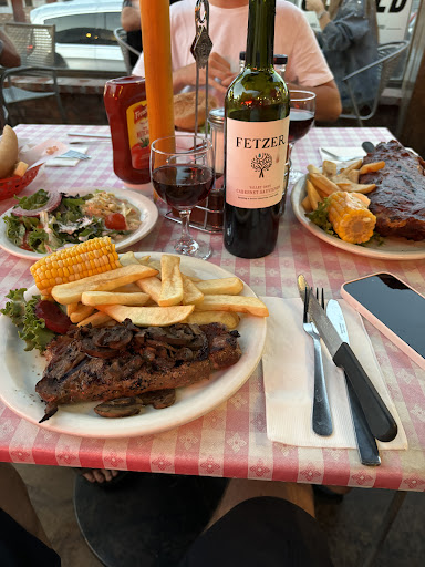 Read moreWith few options close to our hotel, we gave this a try because my partner wanted a steak ( or "stake" as they say on their sign ). Hmmmm...should have known from that. Busy place, but that doesn't mean it's good, just hungry people like us wanting a decent meal. Had to wait and was told to wait in bar. Ok...we'll have a glass of wine while we wait. Bar full with guests waiting and no service at bar. Were then seated shortly thereafter. Server prompt and friendly. The $24 certified angus "stake" was thin, fatty and lacked flavor...like it was from the meat counter at a cheap supermarket. Baked potato and corn on the cob must have been sitting in the warmer for days. Both were grey in color and inedible. The only redeeming thing was the salad bar. Not alot of fresh veggie choices, but for all you can eat for $10, you can fill up on soup, salad and fresh rolls and skip the overpriced "stake". Save your money and appetite for a...