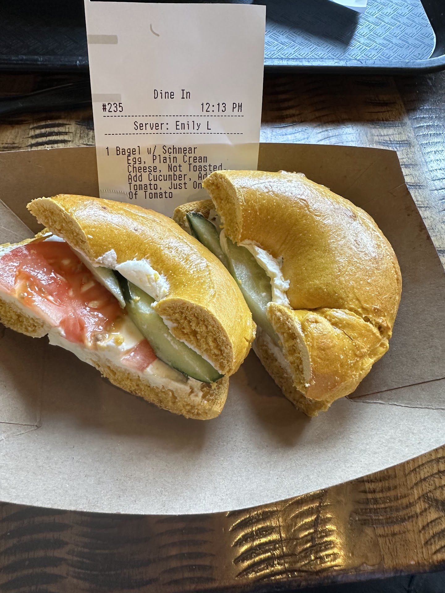 Read moreSmall cramped place but a least had seating outdoors. One of the employees brushed by the plastic cups at the register and after picking them up, did not throw them in the trashcan, but took them in the back. Are you drinking from the cup that landed on the floor? Who knows! Couldn’t see the menu on the back wall due to the glare and no paper menus available, so they said to look at the menu online, which has no prices. Annoying. After placing my order, the girl said just hit continue and before I knew it I was giving a tip. My fault for not paying better attention. This new tip before you receive your food is not appreciated. I had the egg bagel with cream cheese, cucumber, and a slice of tomato. The bagel was hard AF and dry, and the cucumber was thick and sour. Couldn’t cut it with the plastic knives they provided so I had to take it back and have somebody cut it for me. So hard to chew. overall my first eating experience in Mammoth was not enjoyable. We won’t return to this establishment. Do...