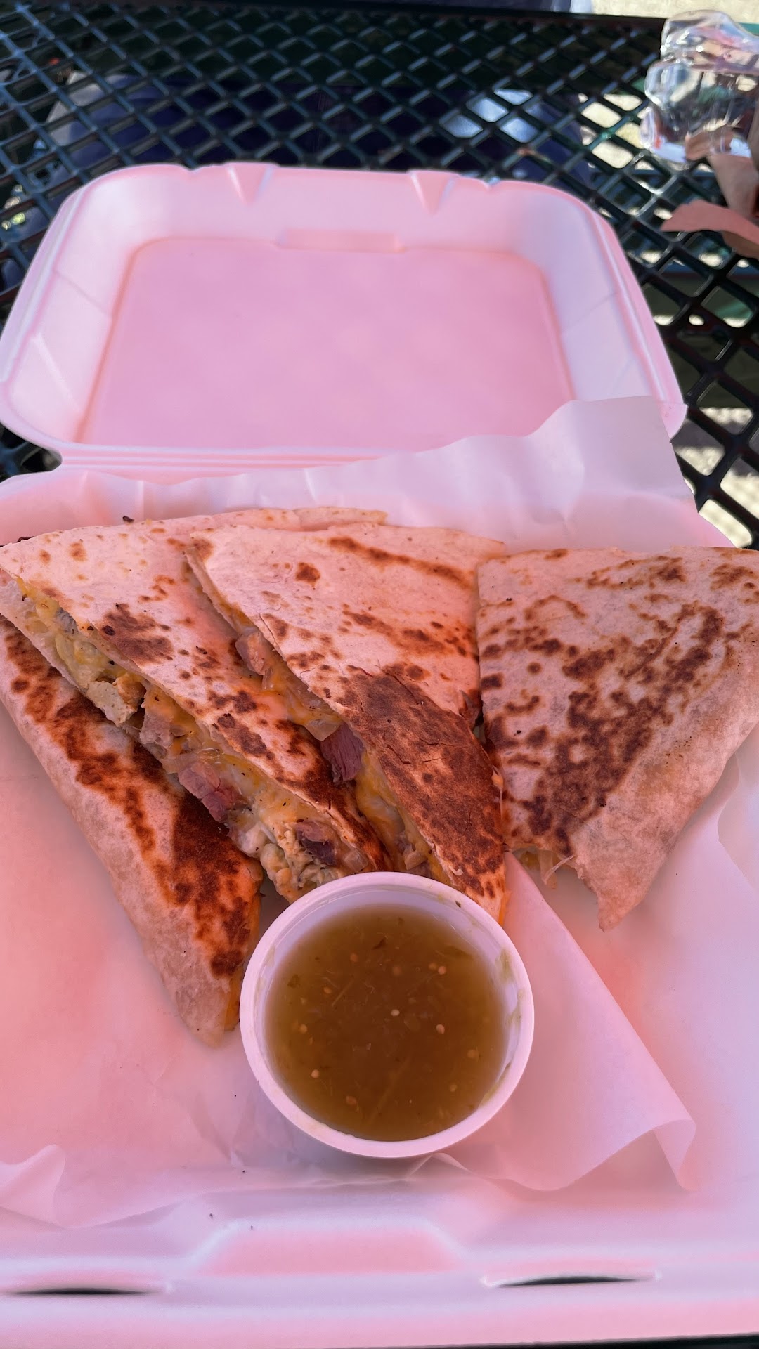 My group of 5 ordered two quesadillas (choice of red or green salsa), 2 Mac n cheese bowls, and 1 smoked tri tip sandwich. We all REALLY enjoyed our food! If we didn’t finish it there, we took it home for leftovers. We ordered 2 sodas for $2.50 each, and they only have can options. The guy serving us had little to no patience to clarify menu items and made it unnecessarily awkward when he replied “Uhh… I guess?” when I asked if I can add cheese to my tri tip sandwich.