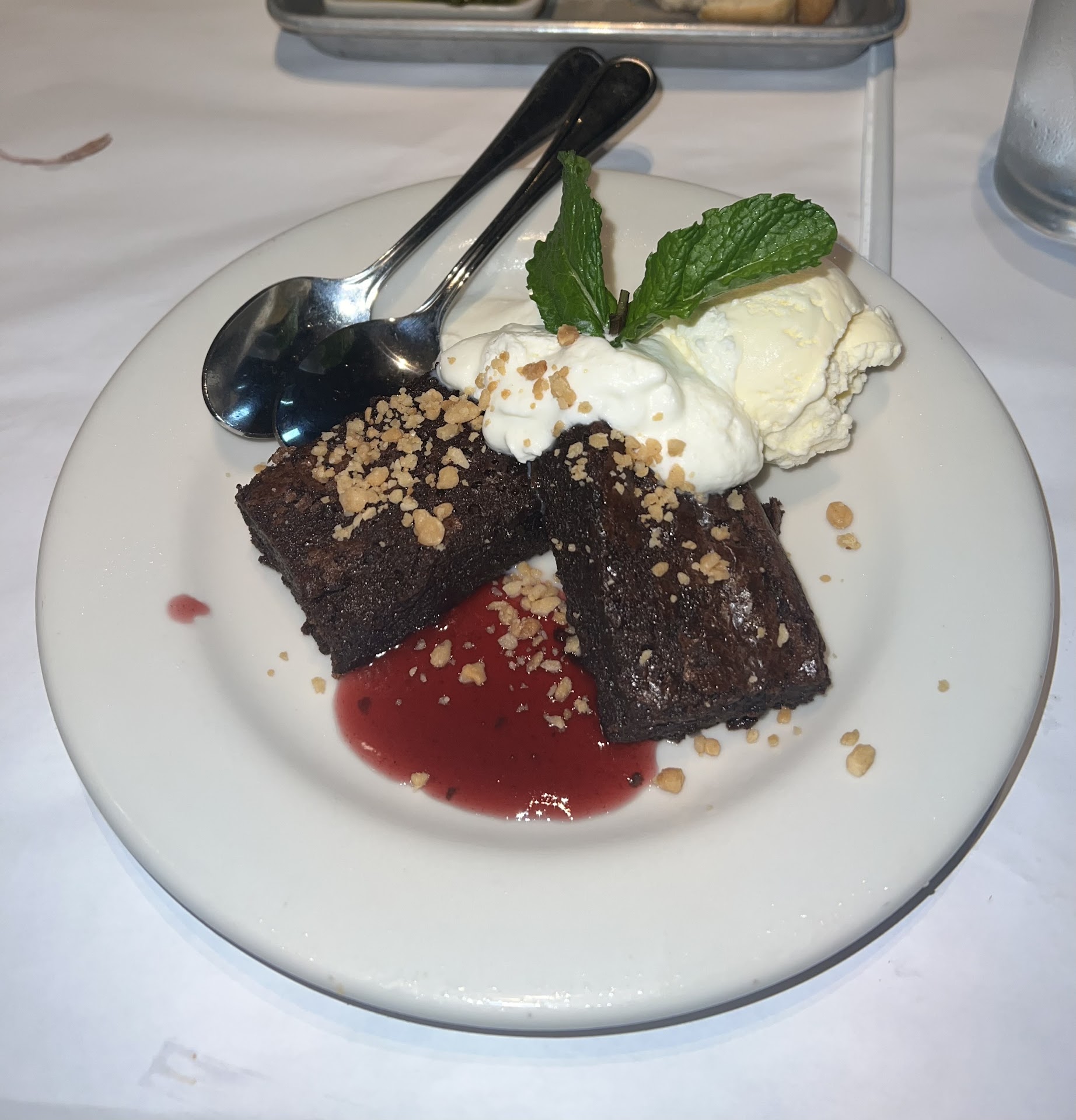 My salmon was, in a word, disastrous. What was pitched to me as salmon and shrimp with asparagus sauce and grilled tomatoes/ side of asparagus ended up being overcooked salmon covered with a very thick amalgamation of something like cream cheese, mayo (?) maybe artichoke hearts shredded up(??) The sauce was one of the most vile things I've ever tasted. I'd like to say that's an exaggeration, but it isn't. It tasted, and smelled, like vomit. The salmon itself underneath was overcooked and dry. The shrimp (3) which it came with were also very overcooked and dry. It came with 4 halves of grilled grape tomatoes and 4 grilled asparagus. (4? Seriously, for an entree portion?) Those were delicious and a very nice respite from the rest of the entree. As a note, this 'sauce' was the sort of thing that glazes over with a strange and unappetizing skim of a different color as it sits.