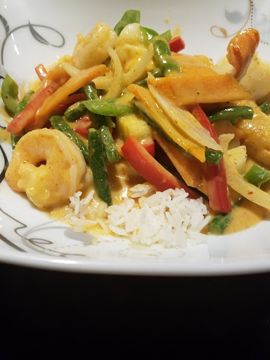 I got a hot green tea and seafood curry. Portion was very decent, with a lot of tender sea scallops, shrimp, battered and fried chunks of fish, and half a lobster tail, along with a large variety of perfectly tender-crisp veggies. For the price I was pleasantly surprised at the amount of seafood. My dining partner got another seafood dish with chicken and veggies that was also very nicely prepared.