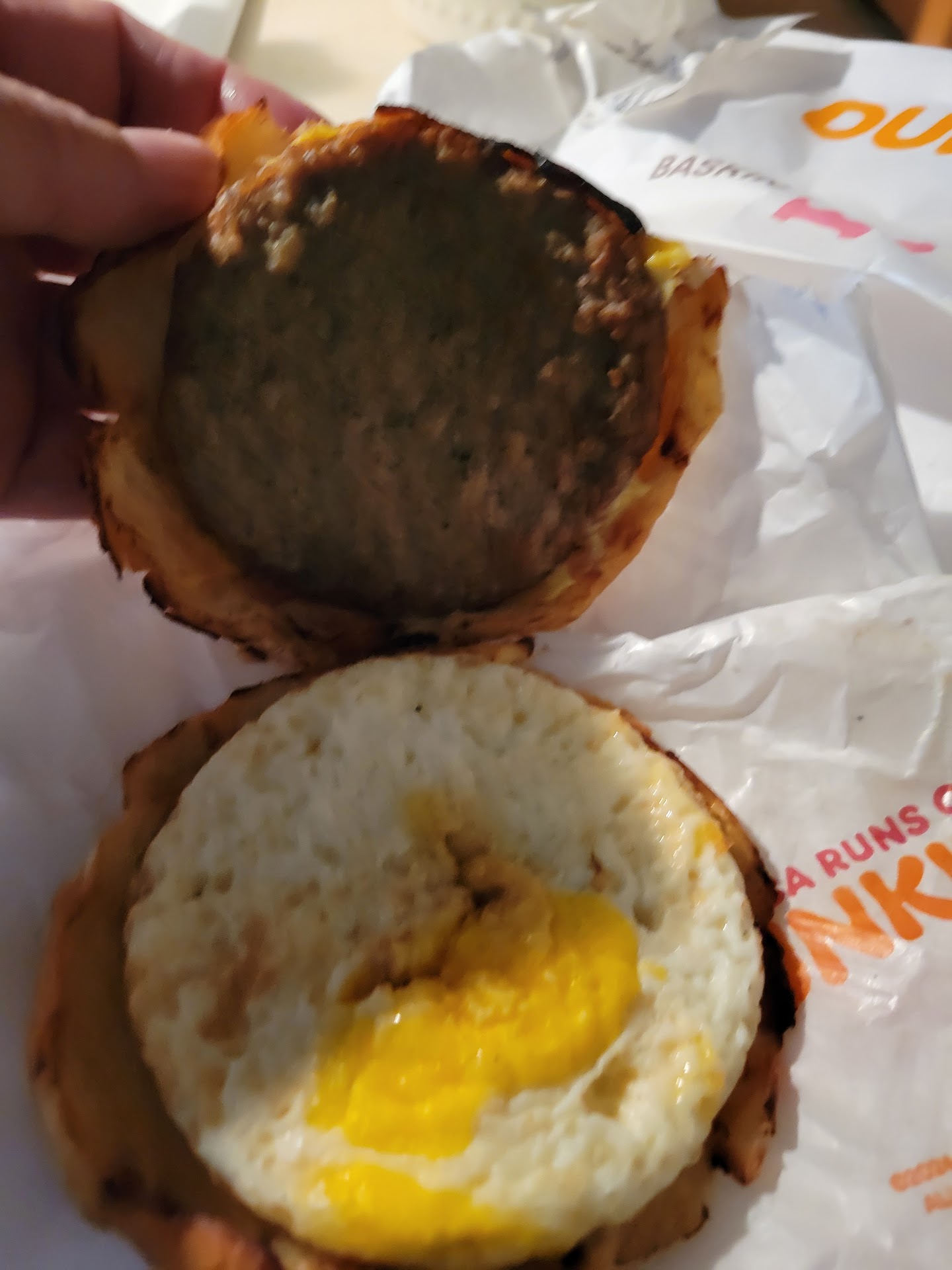 This is a double store Dunkin Donuts and Baskin Robbins. Dunkin is on the left. There were 2 employees that I could see handling walk-in traffic and drive-thru. It was nice to see a clean store when I mostly do the drive-thru. This location has a wider selection of donuts that I haven't seen available at other locations. I was greeted warmly. I was interested in a dozen donuts, but they didn't have a dozen of one flavor displayed. He checked in the back, and they had more. I also ordered the $6 meal deal! You can get sausage, egg and cheese on a bagel or a croissant. You also get 6 hash brown rounds and a hot or iced medium coffee. The younger employee asked a few questions of the other employee, so maybe he was new. I had two separate orders and had to ask for a cup holder and a large carry bag. The store started to get crowded as I was walking out the door. Great visit. Wish they had the same inventory at every location, including some of the donuts that are advertised online but unavailable...