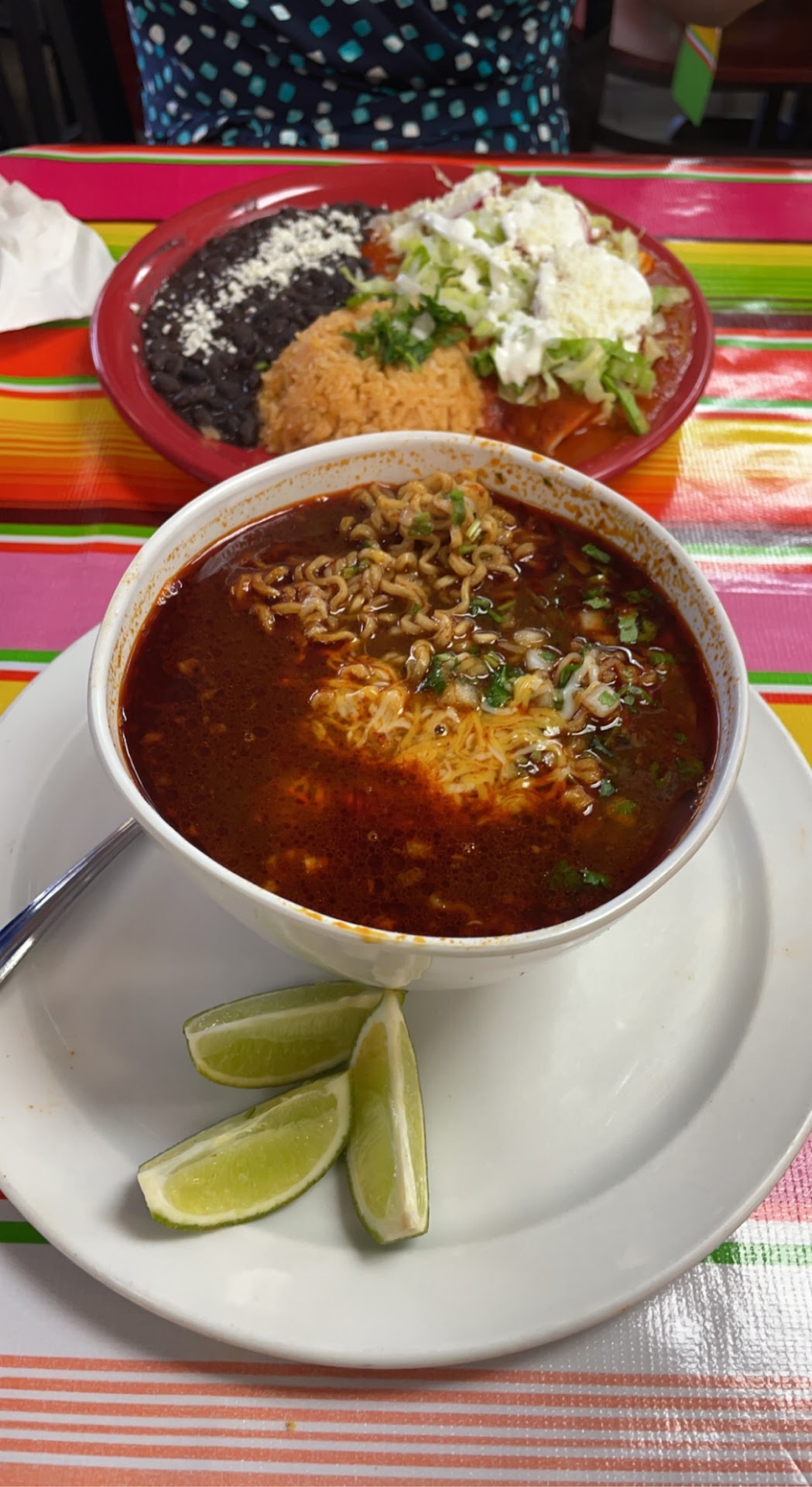 Iâve passed this place a million times in the last two years and have been wanting to stop for a while. Tonight I did. My DD and I ordered a cheese enchilada platter with a side of chile relleno and a Birria Ramen. We were reading they brought a basket of chips and three salsas. One was a mild green tomatillo with very little heat, one was a smoky chipotle with medium heat, and the main one was a traditional salsa. The chips were good. They are on the thicker side so they are great for dipping and have a great corn flavor. The weight staff was extremely friendly and made sure to refill our drinks and clear our empty plates promptly, which I appreciate. Call my daughter took her first bite of the Birria Ramen, she said, âthis is literally the best th. Iâve ever put in my mouth.â Important to note that she developed a fondness for Ramen when we lived in Tokyo. Adding it to the birria, took it to the next level. If you order it, be extremely hungry, or share! They serve a ridiculously generous bowl of soup with tons of Ramen, chock full of the most tender and tasty Birria. I definitely thought a little squeeze of lime was a necessity! Love that little bit of acid. When I was five I used to go to a Mexican restaurant with my mom. Itâs because of this that I judge every Mexican restaurant based on their cheese enchiladas. Do not do that here. These enchiladas are authentic! And that is completely different than what we are typically used to. Thatâs not to say donât order them, itâs just to say donât expect them to be your typical cheese enchiladas. First of all, their salsa Roja is quite a bit spicier. Also, the cheese is a white Mexican cheese with the texture almost of a paneer (Indian) or block of feta. It doesnât melt. That all said, it was delicious. And spicy. I think I will try them next time with a salsa verde or even molĂ©. That same cheese is in the Chili Relleno, So once we got used to the idea that our cheese was not going to be melted, we could just enjoy the flavor. The sauce had a hint of cinnamon and it wasnât spicy, it was just delicious. Did I mention how friendly the wait staff was? Even though we didnât have room for it, we were intrigued by the Oreo cheesecake. It was really good but seemed like it had been prepared elsewhere and had been refrigerated for a while. Next time I think Iâll go for a flan. Anyway, if you havenât been here, try it! They have sandwiches, burritos, the most amazing Ramen etc. Just make sure you donât go thinking it will be like any other Mexican restaurant youâve ever been to...