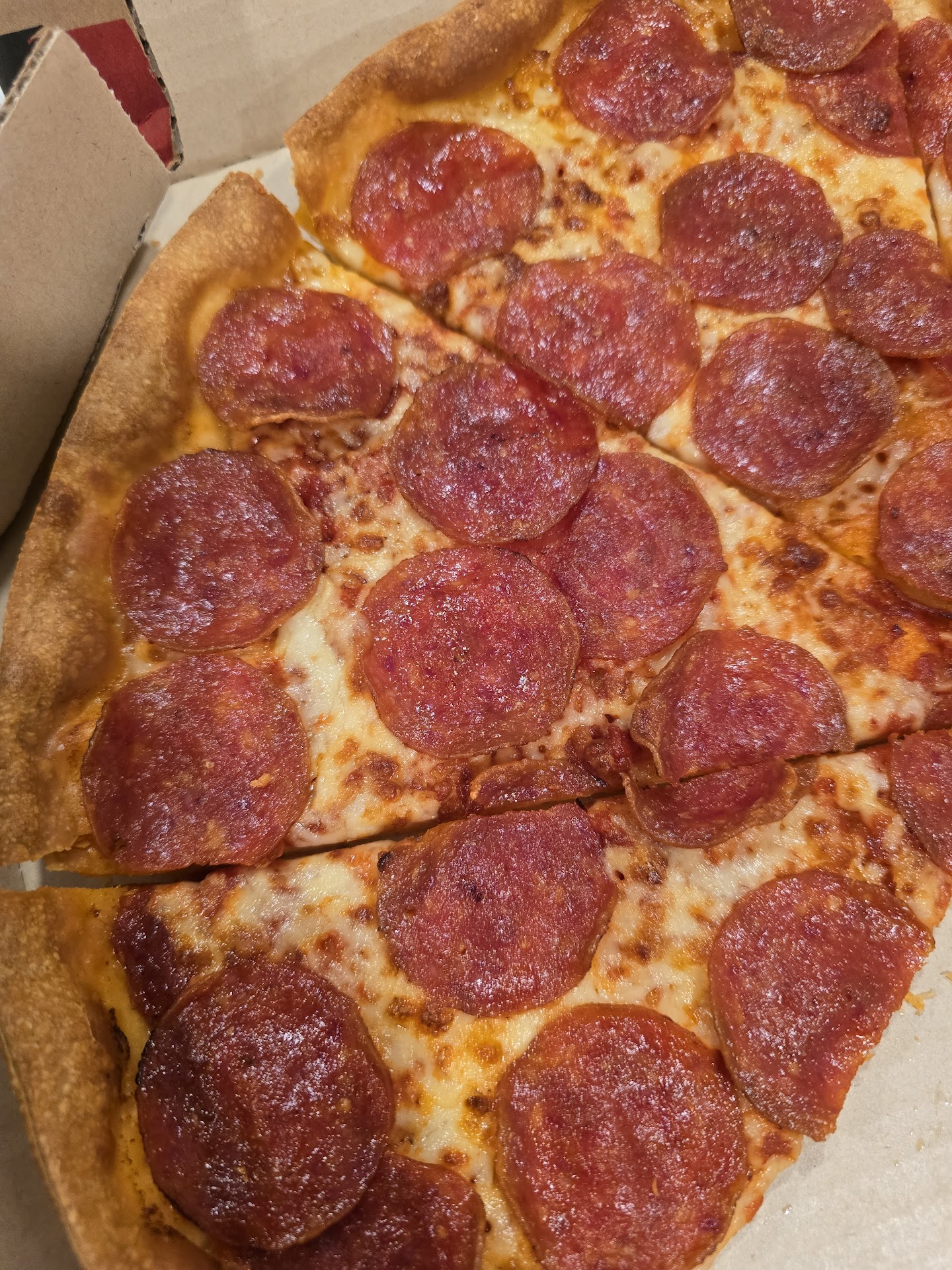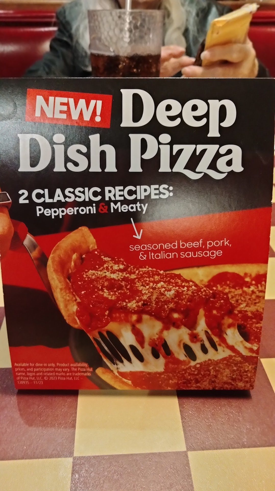 Got an email announcing a new deep dish pizza at pizza hut. Dine in only. I love a good deep dish, and haven't been satisfied with any outside of Chicago. So I was psyched to try the huts. Let me first say this was an excellent pizza, perfect deep dish, it was as good as I have had anywhere. I will be back. That said, as I mentioned, it's dine in only. I see why, it has to be in the pan or it falls apart, as any real deep dish would. But you can't preorder dine in on the app, nor online. Pizza huts online apps really stink. Ok, so I drove in. The kid behind the counter didn't know the two styles available ( pepperoni or meaty). So I said pepperoni and sausage . Then I sat down and saw the table tent pictured, saying the types. I went straight back up and showed him the ad, and said, I want meaty. "But I already put it in". I told him to change it. He whined again, I already put it in. He didn't know the menu, then he couldn't be bothered to fix it. I might add, we were the only customers in the place! Later, after about 10 minutes, the cook/manager came out to tell us the deep dish takes 20 minutes (I expected it would, it's deep dish) I mentioned I wanted meaty, and he said he would make it, and did. When it came out, all hot and pretty, it was fantastic.