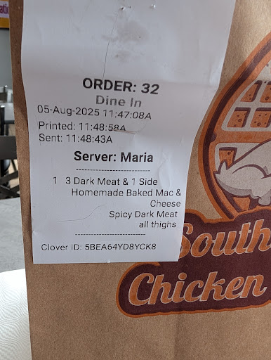 I ordered a 3pc Spicy Thigh meal with Mac & cheese as the picture shows. I waited around 10-15mins at a table before the cashier(who is very friendly) let me know my order was ready. When I returned to my table I of course first went right for a spoon of melty M&Cheese but I discovered it was creamed spinach. Not a big deal, as I planned to eat at the restaurant anyway so I caught the "mistake". I let the cashier know and she apologized and said the macaroni would be right out. I began to eat my chicken when I discovered I was given 2 Mild thighs and a Mild drum instead of the 3 Spicy thighs that my receipt states. I let the friendly cashier know and they apologized and said the "spicy" is just a seasoning powder and that they will ask the kitchen for some. The cashier came back empty-handed saying that the kitchen cannot give out any seasoning, and offered me a drink instead. I don't know the logistics of chicken seasoning transportation, but all I thought(and cashier likely thought) was needed was to throw some hot seasoning into a sauce cup - like 5guys does for Cajun seasoning... Anyway, I ate my mild chicken while contemplating the complexities of seasoning transport, when it occured to me that everything in my order was wrong. I am now done my chicken and the Mac&cheese is still not ready. I believe they must grow the wheat for the pasta from scratch prior to every Mac&cheese order, which is impressive. Between the glares from the kitchen staff when I was ordering, the fact that the entire order was wrong, the fact that there were no other orders expo'd since I ordered that could have confused with my order, and the kitchen staff's refusal to quickly remedy the issues on my order - I am concluding that I got DELIBERATELY messed with. Make sure you tip well for pickup before-hand to avoid offending...