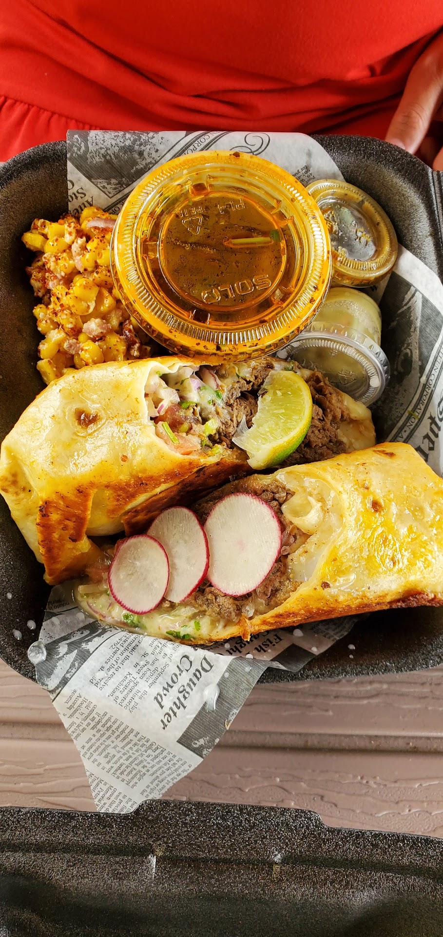 Read moreThis food truck serves excellent Mexican food. The staff's English is decent and they take credit cards. There's a shaded area to eat or to wait for your order. We ordered the caute box (12 birria or chicken tacos in a pizza box), a plate of nachos carnitas, and churros. It was all delicious. We would definitely visit again.