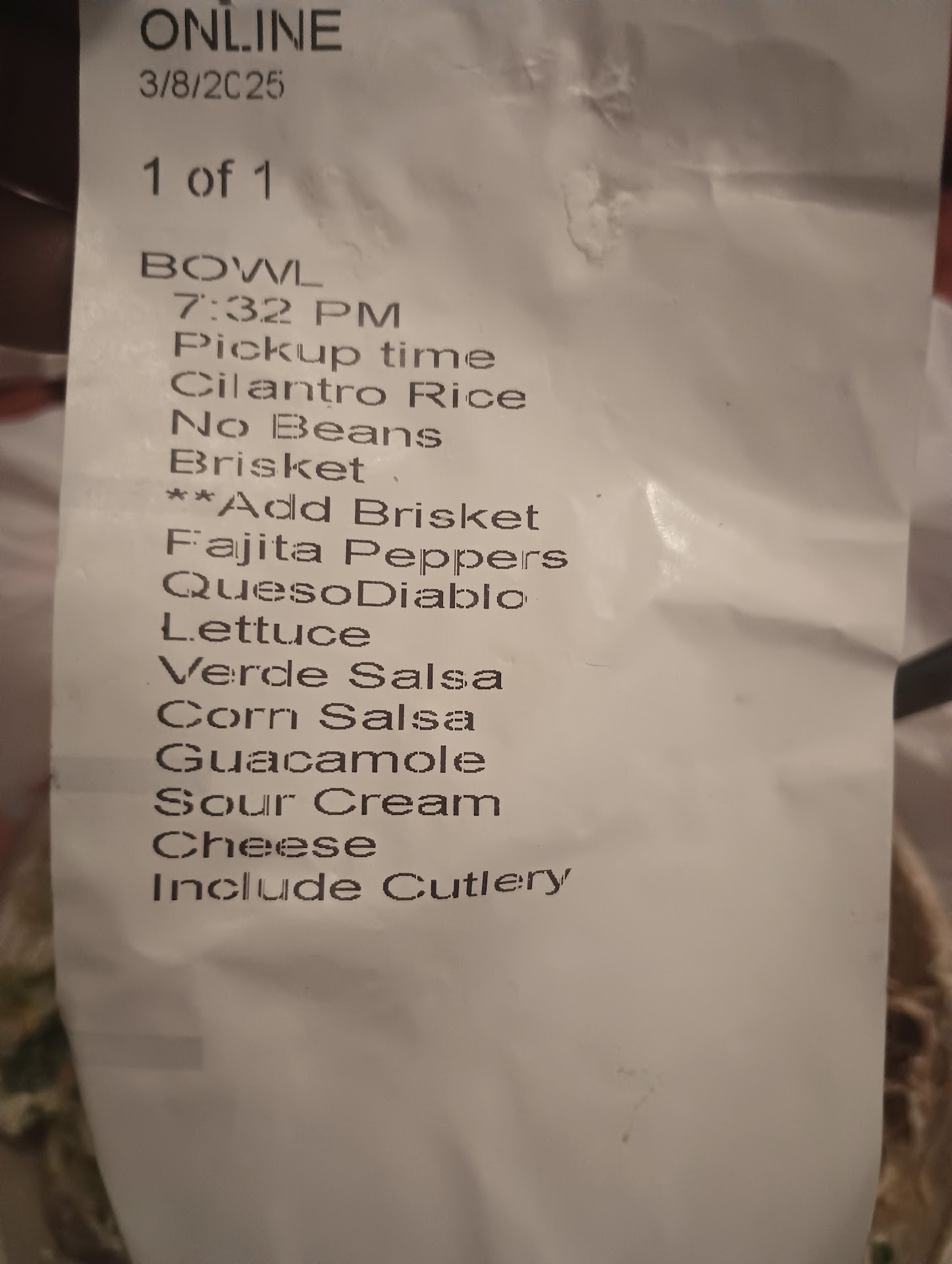 Read morePlaced an online order Fri for curbside pick up. My husband goes in the store after finding an error with the order. Was told immediately by the lady at the counter, “you’re not getting anything for free” My husband responded that he didn’t want anything for free he just wants the right order. Another employee insisted that’s what we ordered. Unfortunately my husband did not have the confirmation email to show them they got the order wrong. I have my email confirmation order and a copy of the receipt printout that was on the bag and whoever pulled my online order can’t read or definitely read it wrong. I wish I would have been there. I’m so upset that this person at the counter immediately thinks we wanted something for free and insisted we got what we ordered. I filled out the Guest relations form on their website on the same night and it is now Wed and have not heard from anyone. I guess they don’t care how their stores are doing. Never ordering online since they can’t even get your order right when the entire order is written out in detail. My online order# was 676678371. The order was 1 reg bowl, 1 mini bowl and 1 taco. What they gave us was 1 burrito, 1 mini bowl and 1 taco. And just so you know, not all people wasn’t anything for free but we all expect to get what we ordered...
