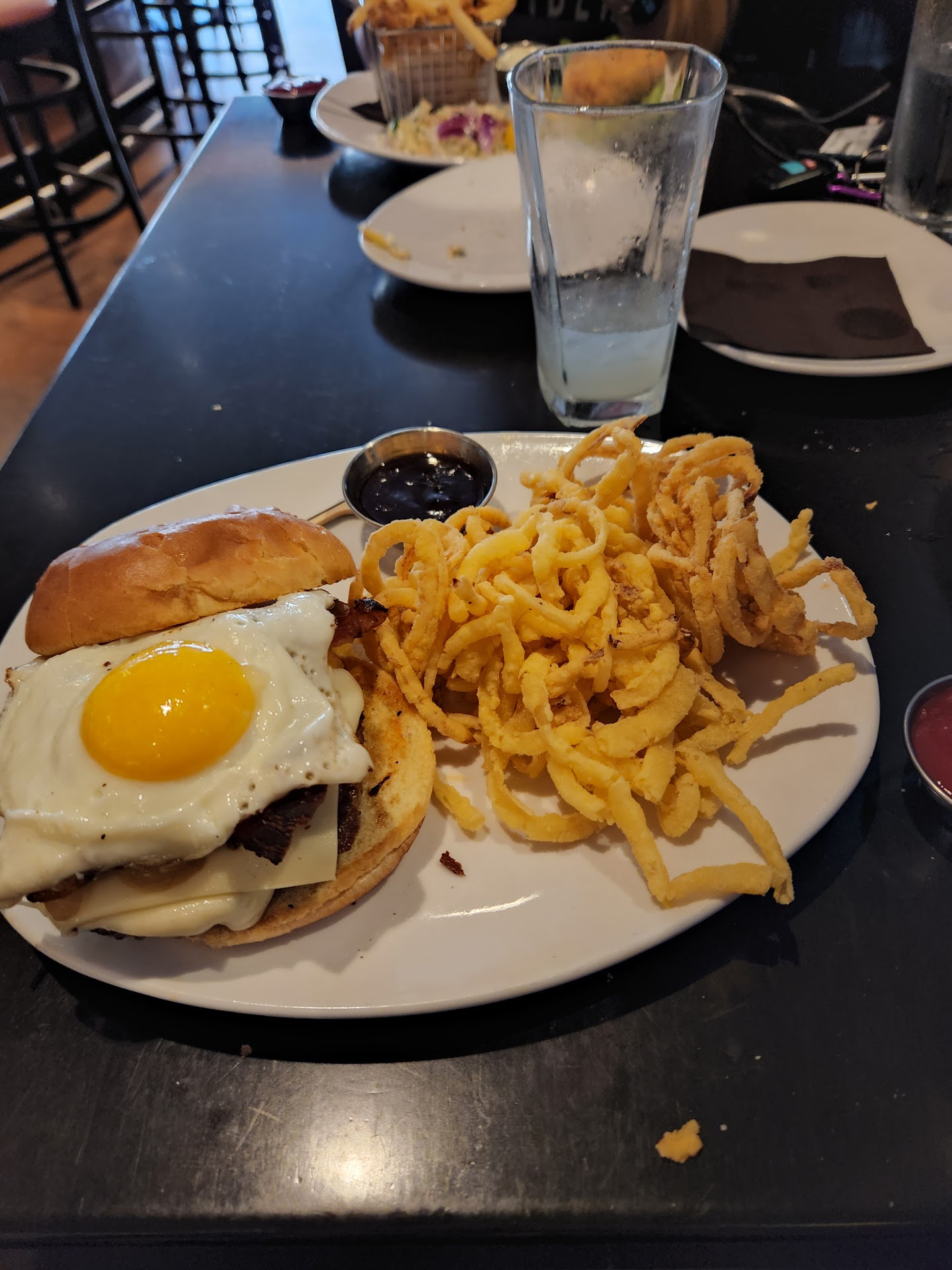 I try to only post good reviews of places, to be a cheerleader, not a complainer. This one, though...meh. Visited for 21st wedding anniversary, our second time eating indoors since March, so we were excited. Made an online reservation (have the confirmation on an email. Dinner for 2 people, for 4:00). Got there ten minutes early, waited a couple of minutes before anyone came over to the host table, and had a grumpy hostess who seemed to be confused by our reservation. Set up a booth for four people and left to get a server. When she returned, she huffed that apparently she was going to have to be our server. I told her we were the only two eating so she could remove the other two places and she told us our reservation was for four people. We said, nope just two of us for 4:00...maybe you thought four people but was 4:00? She said that no, we were supposed to be there at 3:30, for four people. (???) Again, we even now still have the confirmation that shows it correctly. We just laughed it off and said sorry we are lame just the two of us, it's our anniversary... ...but she was grumpy and seemed annoyed with us. She did help accommodate by assisting with modifying fried pickles(app) to have a vegan batter, which was awesome. (They were DELICIOUS!!!) They were out of the bourbon hubby ordered, and the drinks were very watered down. Mostly ice. Asked for waters with second drink orders and got the drinks but no waters. The dinners looked plain and bland but were actually good and the portions of both the apps and the dinners were really generous! The price was spot on, not pricey at all. I think with two apps, four booze drinks, and two entrees it came to $107, which seemed very reasonable. The outside patio looked beautiful. The reason for the mediocre review is mostly just because of the attitude/vibe of the staff. I watched them and there seems to be an underlying unhappiness of the staff there. They were tense with each-other, unsmiling, and snippy. Which is probably why our host, turned server, was snippy with us. I overheard a bartender snip at a customer, too, so it wasn't just our gal. I don't know if it's just because of Covid stress or if this is the usual vibe here but it kinda put a damper on our big anniversary dinner out. Stinks to go somewhere and feel like everyone is angry at each-other and then annoyed that you are even there. We went to another place after dinner, for another drink before our visit to the Palace, and the difference between the contentment of the staff was huge. I will probably still have us visit here again, just so if things seem more friendly next time, I can leave a better review. 😊 PS: editing to add: hubby reminded me to mention, for anyone that would want to know: the cooks didn't wear masks. The tiny staff room/pantry, where the servers congregated, to grab stuff they needed, was crowded and most took masks off while in there. Noticed a gal behind the bar, stocking glasses, with no mask. Just mentioning for those that wouldn't be comfortable in...