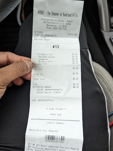 Read moreWe ate for the first time at Charleys on July 31 and it was a terrific experience. We dined at the Connecticut Post Mall location in Milford, CT. Everything was excellent, from the quality and freshness of the food to the customer service and cleanliness. The manager named Bobby was friendly and assisted us with downloading the app. We both downloaded it and received a $5 discount. The food was prepared in a timely manner and served hot. Two thumbs up to the...