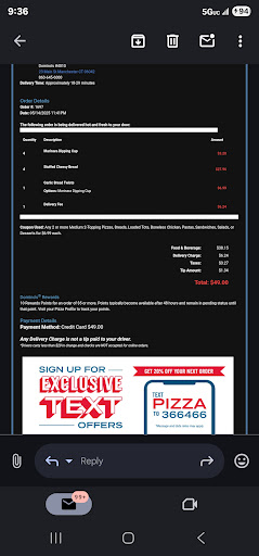 Ā Ā Ā Read moreCouldn't find a way to write a new review, so I was left to edit this one to add another review. I spent far more than anyone should at Domino's tonight, estimated time of delivery was 29mins, over an hour later Laith showed up with the food, he was nice and apologized for the wait. He stated it was abnormally busy. I said nbd we appreciate it! Get the food in the house to find out the food was cold, not even warm. Ugh, ok we'll reheat as we eat. Then I notice there's 2 overdone cheese pizza's, I only ordered 1. That means the chicken Alfredo bread bowl I ordered was missing. I paid for it and I wanted it, pretty reasonable. I called to explain the situation and there was no hello or anything polite said, I was told they're too busy and would not be accepting anymore orders. She was about to just hang up until I said I'm not ordering, my order is messed up. She huffed and puffed and said we're busy idk what to tell you. Another super unacceptable situation. I said um ya I want what i ordered. She immediately puts me on hold, approximately 5mins later a guy gets on the phone and states they're too busy and not taking orders, I immediately interrupt and tell him I'm not ordering!!! I want what I ordered and the food was cold, not even warm, not even slightly. He also stated that there was nothing he could do about it, he was rude af and I lost it! I called corporate, which we all know is useless, especially on a Friday night. So clearly no resolution there. At this point my money has been unrightfully taken and I want my $103 back for the garbage that was dropped off and for the food that wasn't. Alllll of this could have been avoided by simple customer service. I didn't even originally complain about the quality , i just wanted the food i paid for that i didnt get???? NEVER spending $$ here again and I expectall my $$ back. This is bs.
