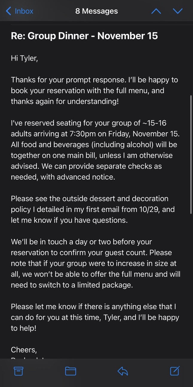 We normally come here once a year to celebrate a birthday but was super disappointed with the experience we had this year and I’m not usually one to write bad reviews. I was looking forward to celebrating my birthday here with my friends. My husband made our reservation for 15-16 people 3 weeks in advance. They sent us an email saying that for large parties, they normally require meal selections ahead of time, but excused it for us and told us to just be patient with the staff (which we always are, we truly didn’t mind, we know the food is worth waiting for!). We had 4 extras try to join our reservation, but the staff said they couldn’t make that work so we did not let them come, no problem! By the time we got seated, the table only had 14 chairs. We kindly & patiently asked them for two more (as our reservation was for 15-16 people) and the manager or whoever she was, came over to our table and approached us in a terrible, extremely negative manner, telling us that our party size was unacceptable (even though we booked in advance and it was accepted). We tried to show her our email exchange with a staff member confirming the party of 15-16 people, in addition to the excusal of preselected meals but she didn’t care (we were still going to pay together on one main bill which was discussed in the email). About 3 minutes or so after this insane reaction, and before even ordering anything, she told us we were going to “annihilate the kitchen” and continued to be so angry with us. This was the worst interaction I’ve ever had from a restaurant employee and she ruined our celebratory birthday dinner that we were all looking forward to. After me and my friends were left speechless with how we were just treated, we left. It was unfortunate because I know this place can be hard to get into, so some servers definitely missed out on a few tables but we did not feel like staying where it was made clear we weren’t welcomed, and instead, were more of an inconvenience to them. If they had told us prior to this, that they couldn’t accommodate our party of 15-16 people, we would’ve understood, we know it’s a lot. But this woman waited until we were sat, to come over and be incredibly rude to us, without even greeting us or working something out (which we would’ve been open to!). Attaching a screenshot below for proof of our conversation. Extremely disappointed with how this was handled and bummed we had this experience that stayed with us for the end...
