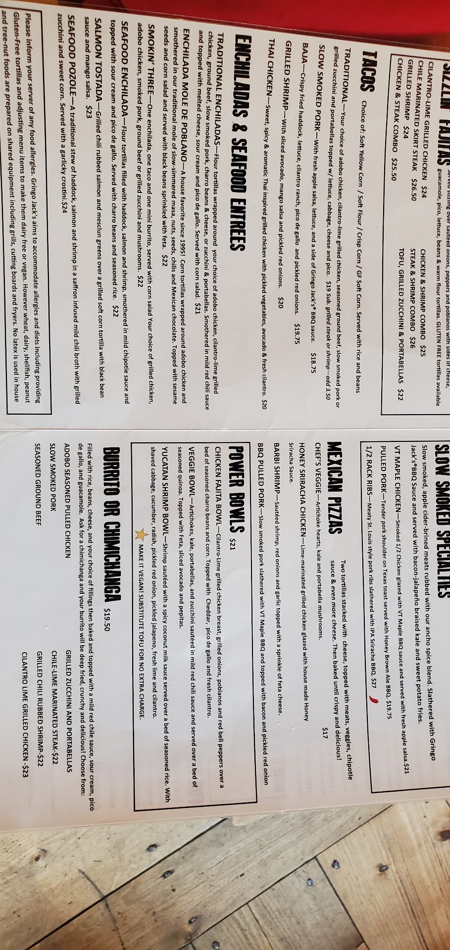 Worst Mexican food we have ever experienced! First of all I am local to Manchester, VT and myself and my family have gone to Gringo Jacks since the restaurant was called Candeleros. The last 3 times I have dined at Gringo Jacks it has been mediocre at best so I can no longer stay silent. This past Monday 10/14 my wife and I went there at 4:30 in the afternoon and the problems started right from the first drink. My beer a Bells Oberon was served flat right from the tap and the bartender should know better. I was still charged $8 for a flat beer and the server should know better. We ordered 2 entries. Chicken and shrimp fajitas and seafood stew. The fajita was served with cold refried beans that had zero flavor. Wilted and brown lettuce and salsa and shredded cheese. Nothing in this dish had any flavor profile. Bland and horrendous. The stew was labeled on the menu as "NEW". In this dish were tiny shrimp obviously a frozen product and the shrimp had a distinct ammonia flavor which means bad decomposing seafood and not edible. The presentation of the stew was a sloppy mess with cold toast points jammed into the stew and unacceptable. It should be removed from the menu not touted as a "NEW" dish. I should have taken pictures. I am not sure what is going on in the kitchen or with ownership but the food presentation and quality has gone down hill and they better get it together if they want to compete in Manchester's competitive restaurant market. Our bill was $70 without tip and the food was not...