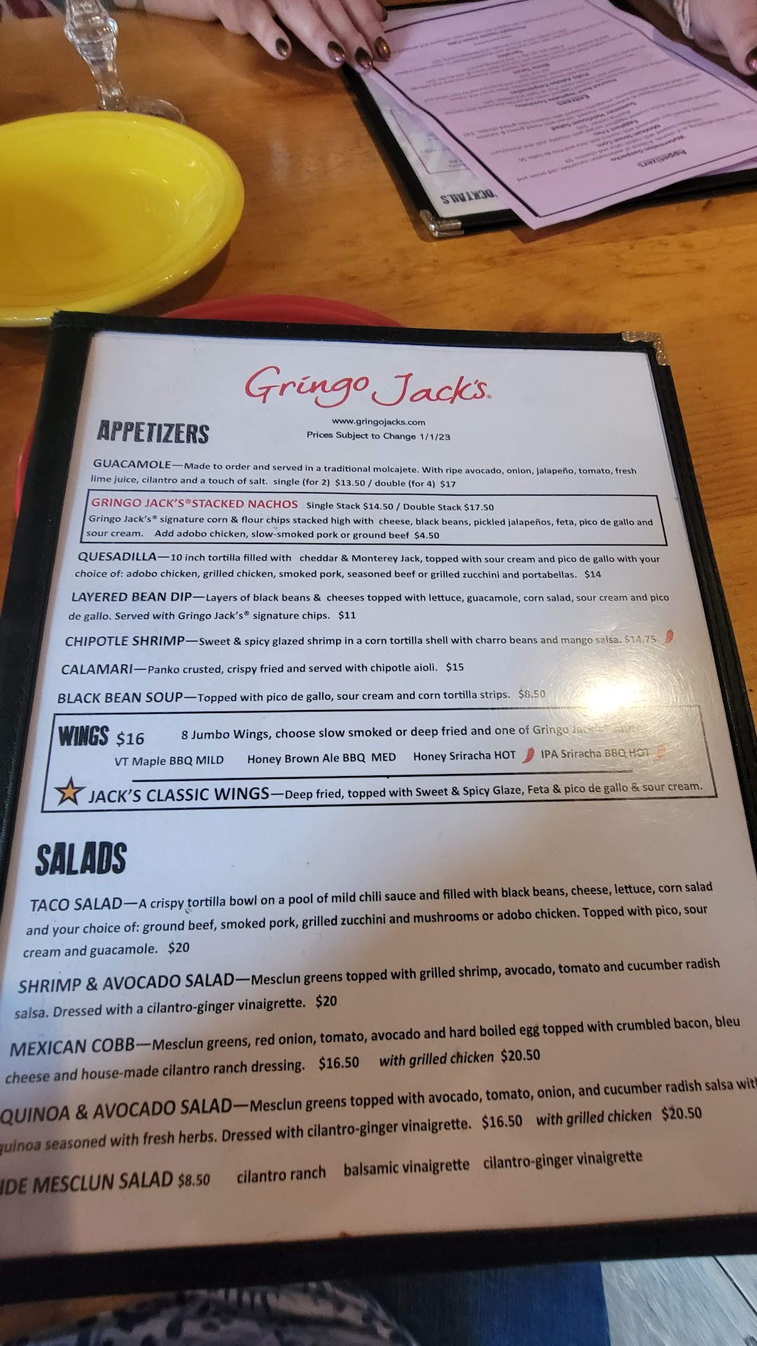 Worst Mexican food we have ever experienced! First of all I am local to Manchester, VT and myself and my family have gone to Gringo Jacks since the restaurant was called Candeleros. The last 3 times I have dined at Gringo Jacks it has been mediocre at best so I can no longer stay silent. This past Monday 10/14 my wife and I went there at 4:30 in the afternoon and the problems started right from the first drink. My beer a Bells Oberon was served flat right from the tap and the bartender should know better. I was still charged $8 for a flat beer and the server should know better. We ordered 2 entries. Chicken and shrimp fajitas and seafood stew. The fajita was served with cold refried beans that had zero flavor. Wilted and brown lettuce and salsa and shredded cheese. Nothing in this dish had any flavor profile. Bland and horrendous. The stew was labeled on the menu as "NEW". In this dish were tiny shrimp obviously a frozen product and the shrimp had a distinct ammonia flavor which means bad decomposing seafood and not edible. The presentation of the stew was a sloppy mess with cold toast points jammed into the stew and unacceptable. It should be removed from the menu not touted as a "NEW" dish. I should have taken pictures. I am not sure what is going on in the kitchen or with ownership but the food presentation and quality has gone down hill and they better get it together if they want to compete in Manchester's competitive restaurant market. Our bill was $70 without tip and the food was not...