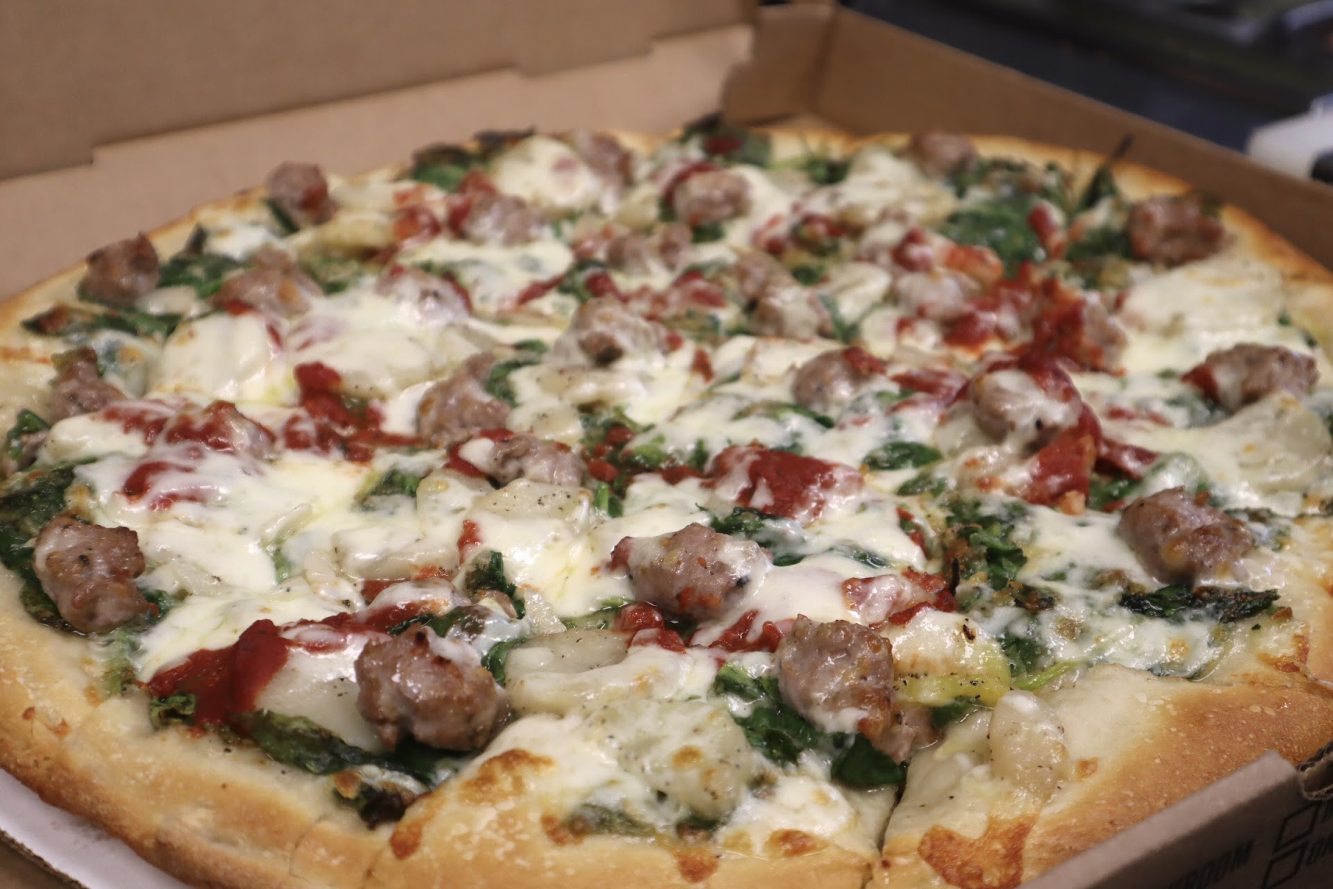 First time here. I did take out on a whim while driving by, called in a large supreme pizza for pickup after running some errands in the area. Cost just under $30 cash out the door (they give cash discounts). Pizza was heavy, as in I was surprised at how much the box weighed. It was even taped shut with 2 pieces of tape, I assume to maintain structural integrity of the box for what must be a beast of a pizza inside. Normally I might sneak a piece on the drive home but I didn't want to unleash this monster in the car , not be able to close the box after the tape sear was ruptured. Safety first (or second or third). For those old folks reading, this pizza reminded me a lot of the original Gino's Pizza on New London Tpke in Glastonbury that I ate decades ago growing up (and occasionally now at the old Prococcino's in E. Hartford now, the new Gino's). It's a thicker yeasty crust that was crispy on the edges and tons of toppings buried under lots of cheese to create very filling bites. This is NOT your traditional New Haven style light weight thin crust 'minimalist' pizza where you often feel more is less. More here certainly means more and this is one hardy pizza! I get that some don't like that - want the thin crust pizza , but I happen to crave it occasionally. So overall I liked it and would come back if craved their more unique style. I can see how if this pizza sits too long and cools off that the cheese will firm up and encase your toppings in a sort of pizza carbonite and have an unpleasant mouth feel - I can see it getting very dense and you fell you re really biting through it so eat it fresh and hot. I did take out and the cashier was right there and able to get my pizza and take my cash quickly so that is my only service experience. Walking in it felt more on the basic side, not bad just basic, fine to grab a pie with friends. Anyway I enjoyed this pizza, it was very filling and I'll come back if I'm in the area and try something...