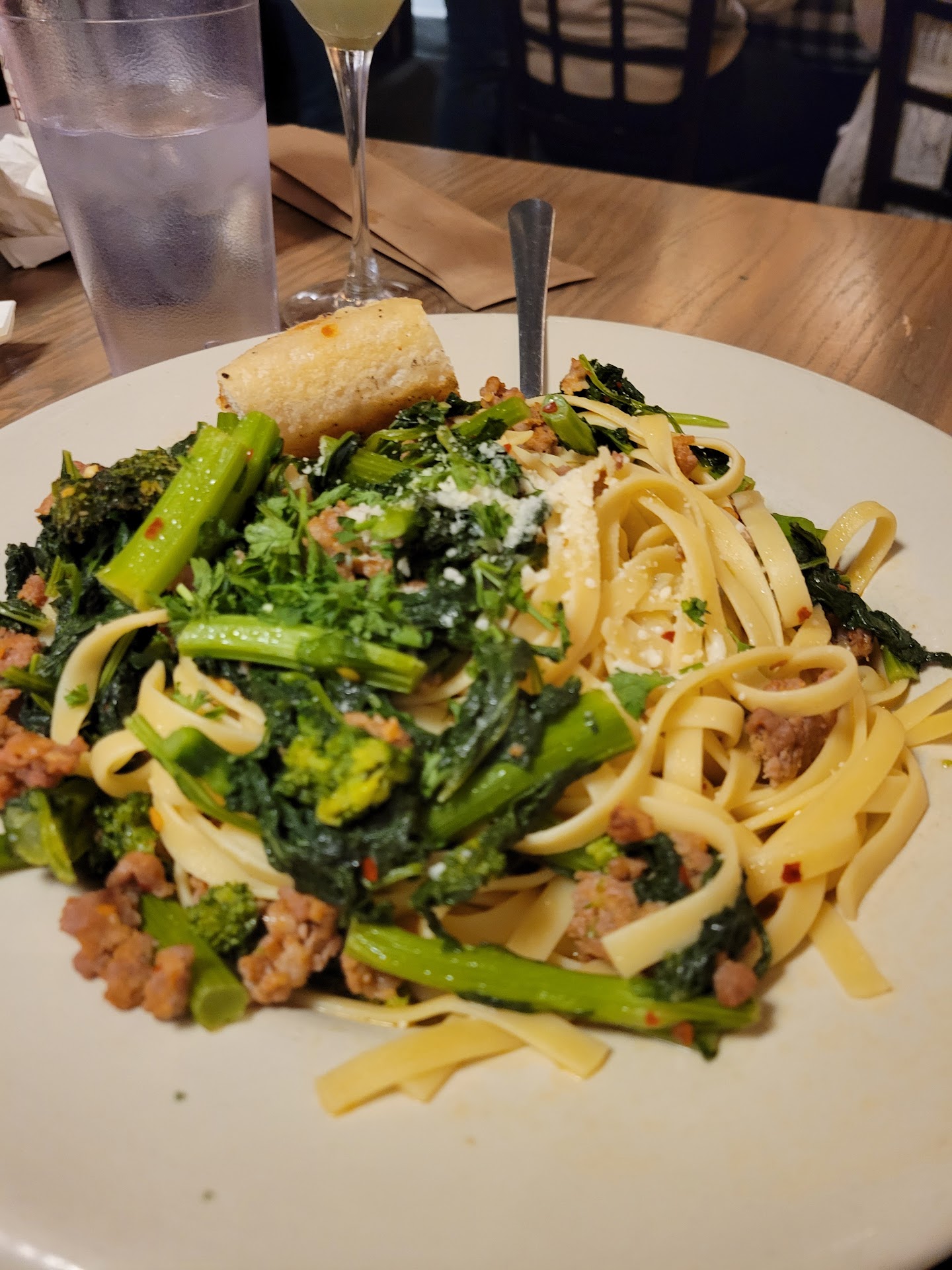 She brought our drinks right away despite dealing with at least 7 other tables at the same time. The restaurant itself seemed short staffed. That being said, we never felt neglected. Once our appetizer was ready, a very nice gentleman brought it to our table. I appreciate the fact that if our server wasn’t available, another staff member brought our food so we could enjoy it hot. We ordered the calamari to share and it was so good! It was served with a lemon wedge and marinara. Not greasy or rubbery. It was light and crispy and hot!